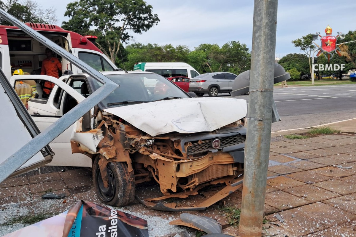 Uma motorista perdeu o controle do carro depois de colisão com ônibus e acabou colidindo com uma parada e um poste de iluminação pública, na tarde desta terça-feira (25/11), próximo ao Centro de Convenções Ulysses Guimarães, perto do Eixo Monumental, no Plano Piloto (DF).