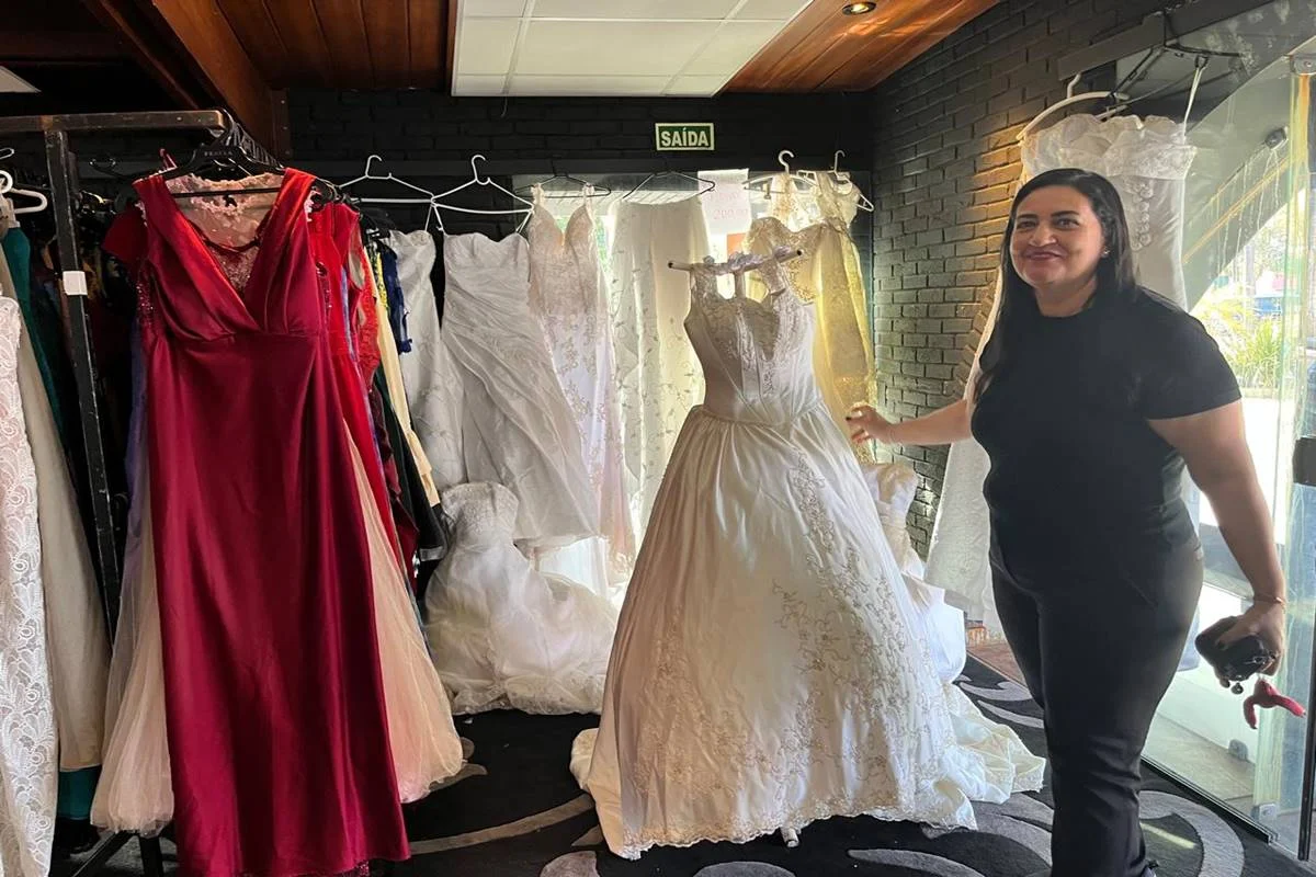 Entre os destaques estão vestidos de festa, ternos, roupas infantis, roupas de frio, botas e até vestidos de noiva