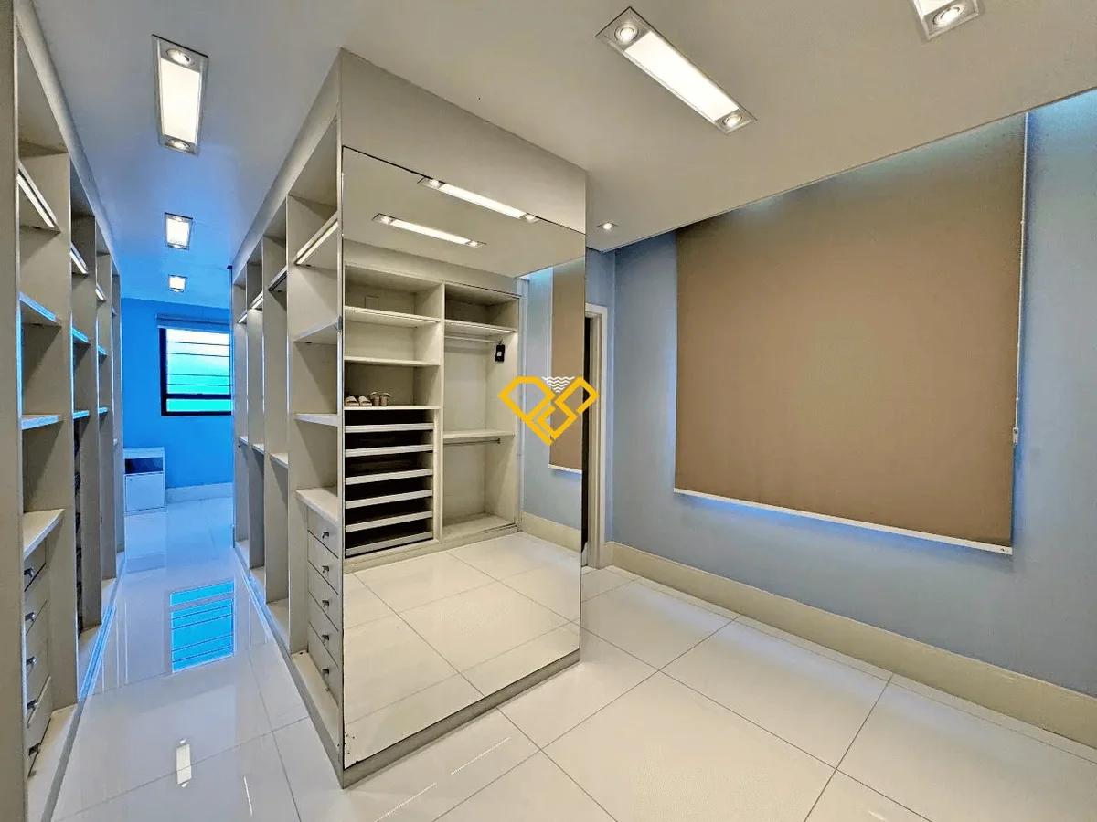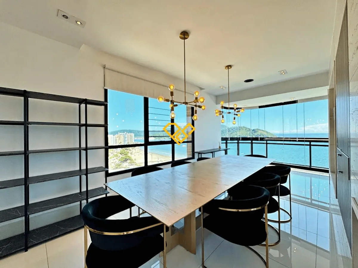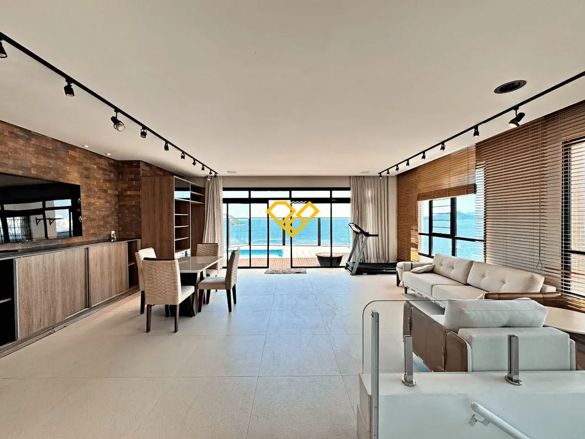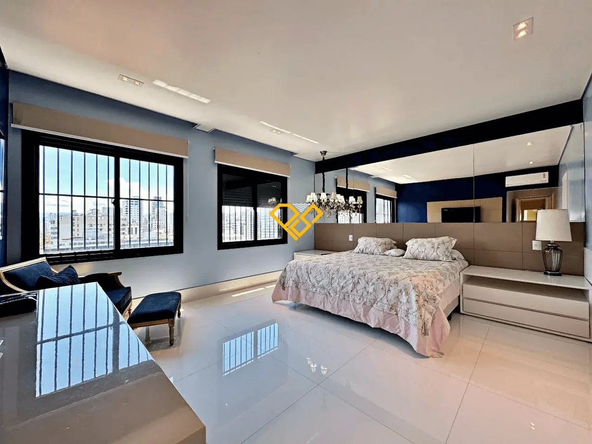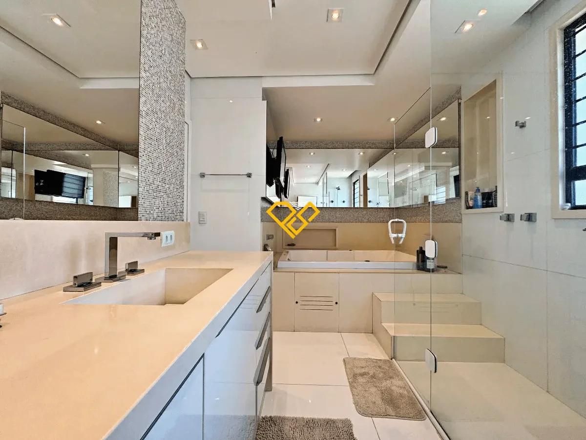 A cobertura possui oito banheiros e cinco vagas na garagem. A casa também é equipada com mobília planejada, ar-condicionado e gás encanado.