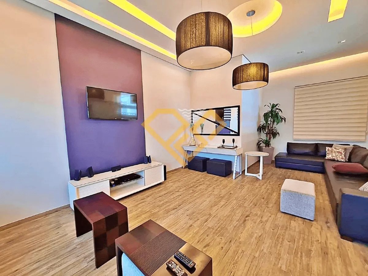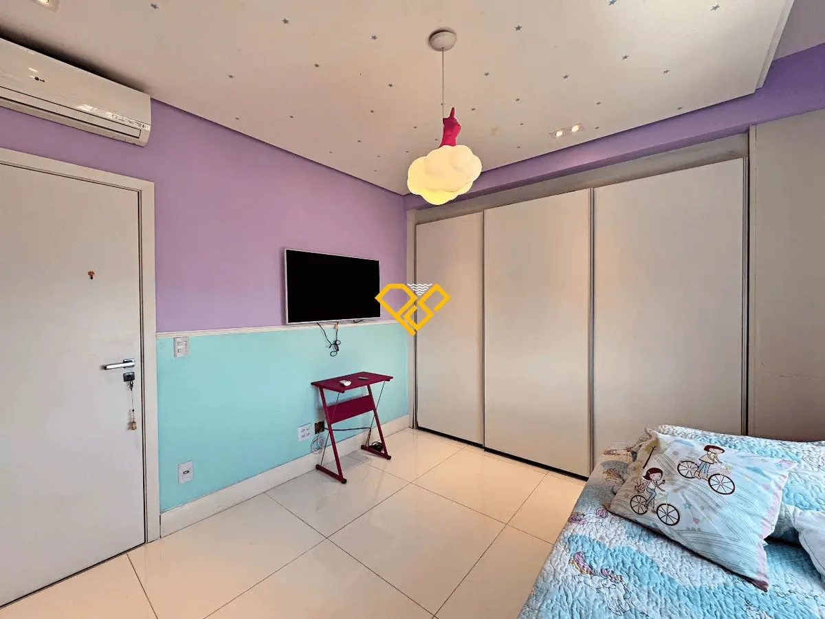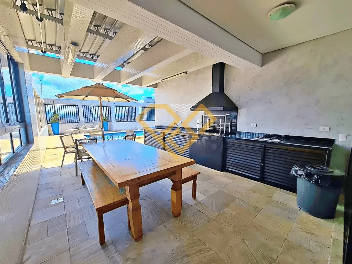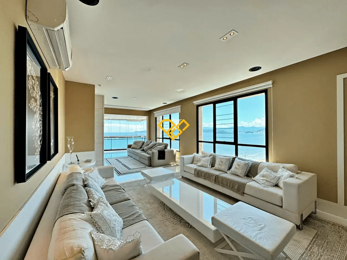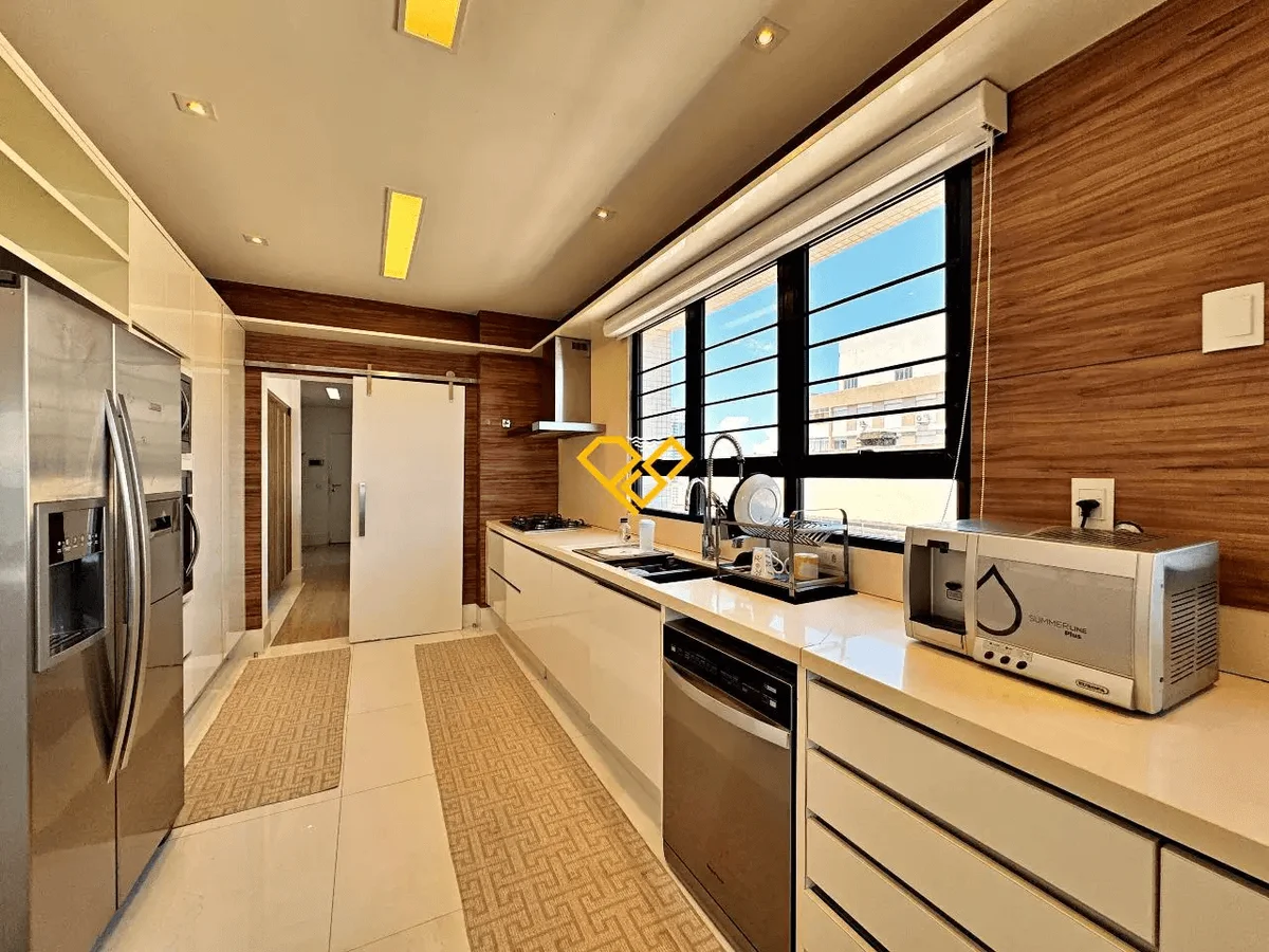 A cobertura possui oito banheiros e cinco vagas na garagem. A casa também é equipada com mobília planejada, ar-condicionado e gás encanado.