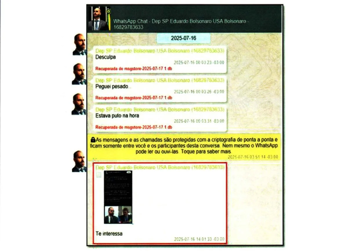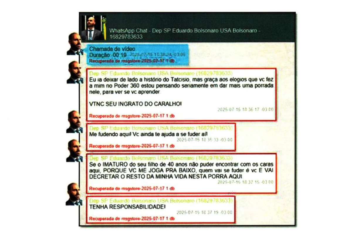 Em mensagens obtidas pela PF e divulgadas em 20 de agosto, Eduardo mostra irritação com o pai e rivalidade com o governador de SP, Tarcísio de Freitas. O deputado chama o pai de “ingrato” e diz que Tarcísio “quer posar de salvador da pátria”.