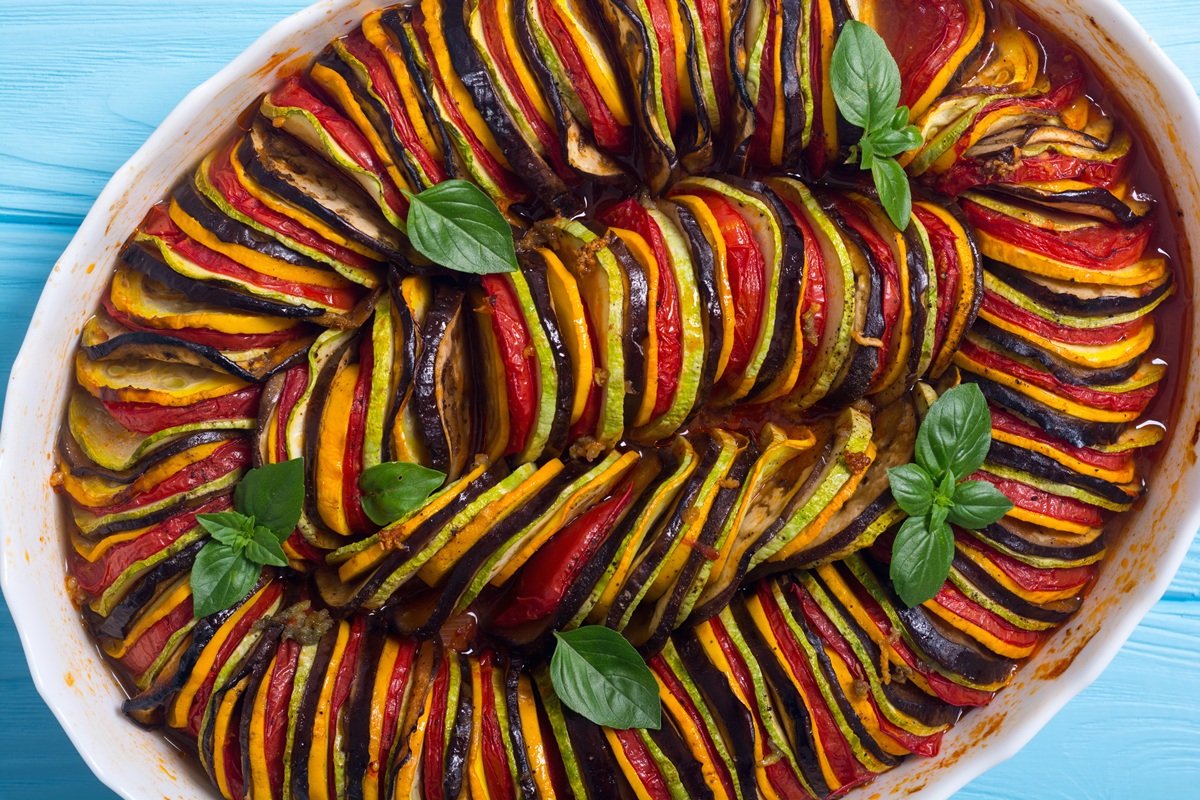 - Monte o ratatouille intercalando rodelas de todos os legumes, formando um círculo.