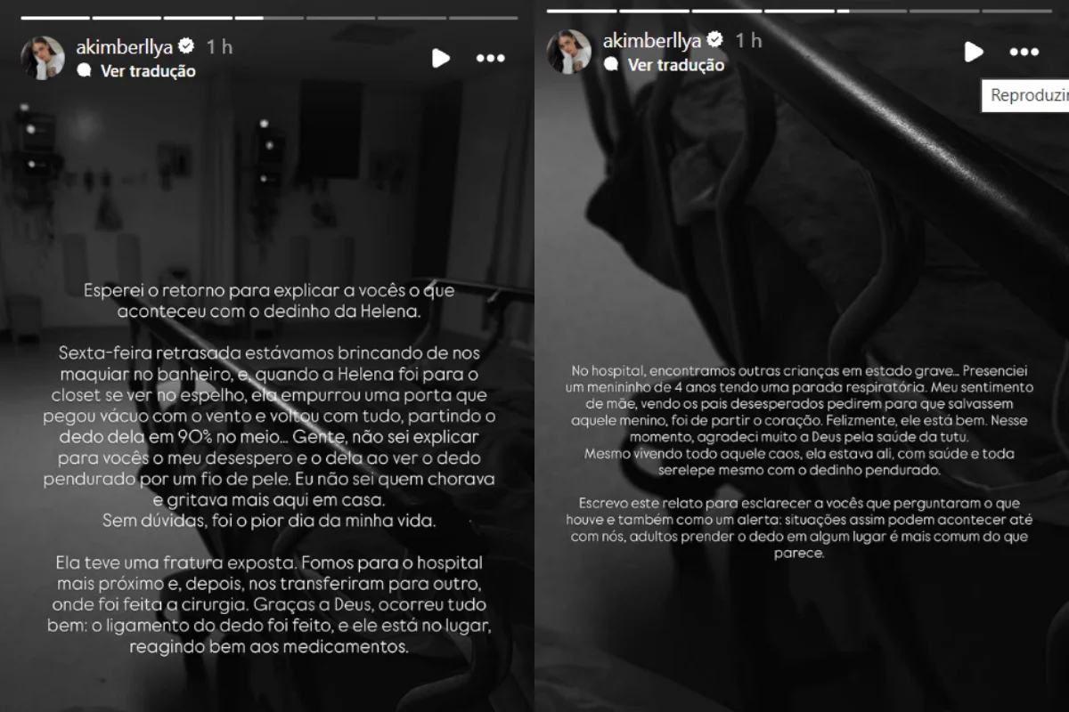 Em seguida, ela compartilhou o momento de tensão que viveu ao ver o ferimento: “Gente, não sei explicar para vocês o meu desespero e o dela ao ver o dedo pendurado por um fio de pele. Eu não sei quem chorava e gritava mais aqui em casa. Sem dúvidas, foi o pior dia da minha vida”.