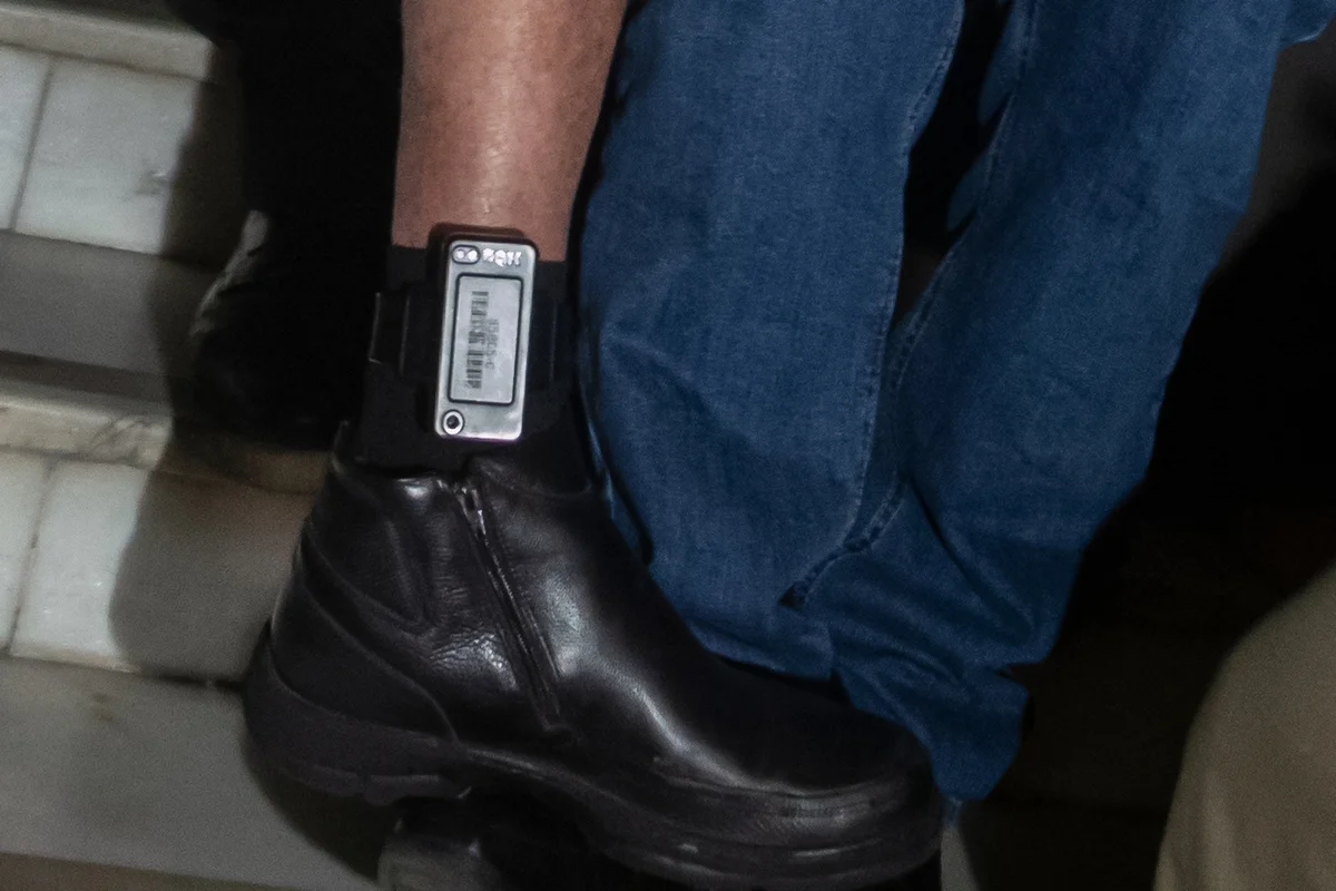 Ex-presidente Jair Bolsonaro mostra a tornozeleira eletrônica para a imprensa na saída do Congresso Nacional