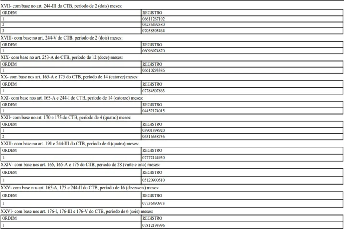 As suspensões variam de 2 meses a 2 anos e incluem infrações como dirigir sob influência de álcool ou drogas; dirigir acima da velocidade permitida; pilotar motocicleta sem capacete ou transportando criança menor de 10 anos e ultrapassagem perigosa.