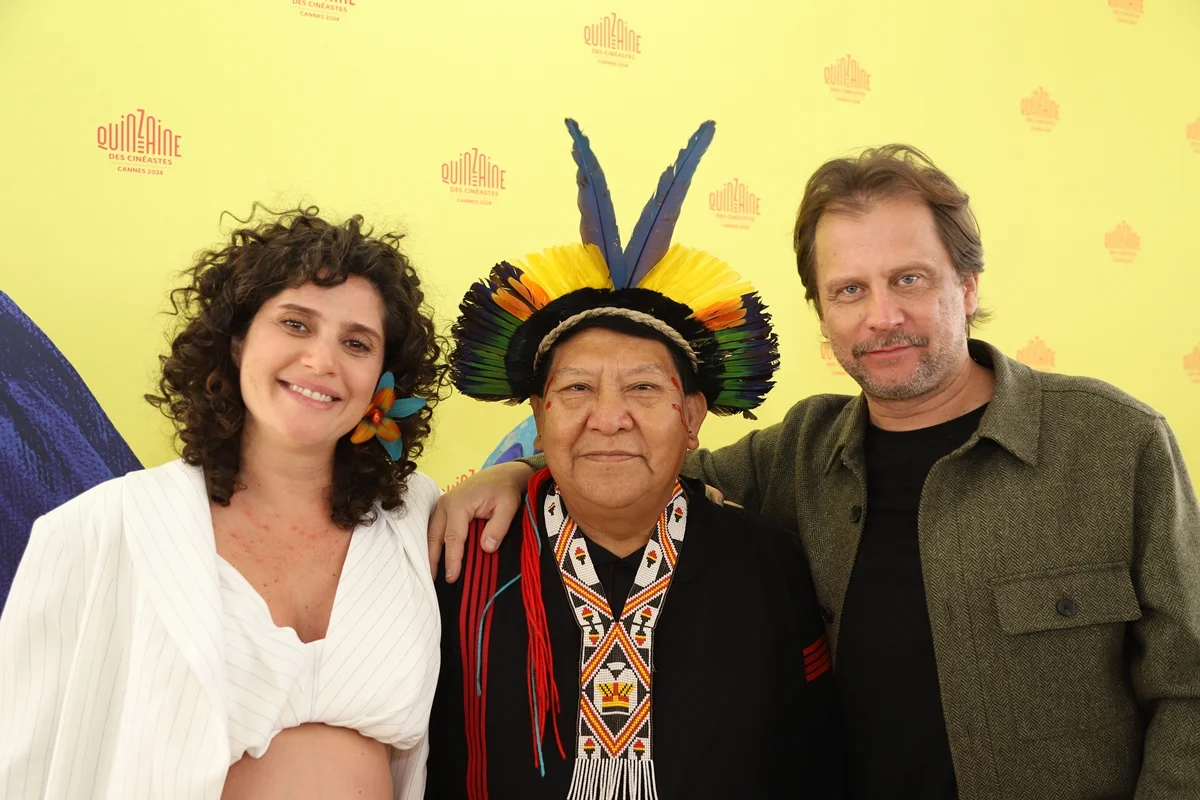 Gabriela Carneiro, Davi Kopenawa e Eryk Rocha no Festival de Cannes
