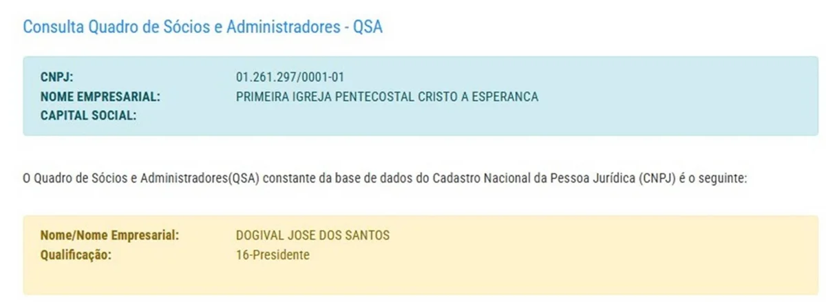 Dogival, que assinou acordo de cooperação entre a AAB e o INSS em 2023, criou a Crusada Nacional de Evangelismo – registrada com S no lugar do Z -, em 1996, sob o nome fantasia “Primeira Igreja Pentecostal Cristo a Esperança”. Conforme dados disponibilizados por Dogival à Receita federal, a instituição religiosa funciona em Ceilândia.