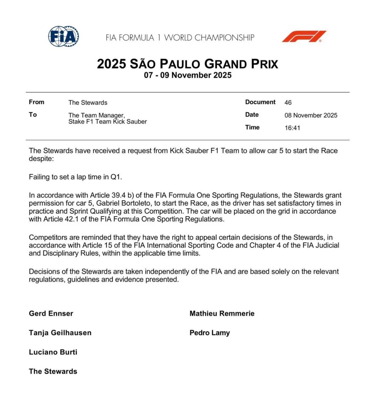 “De acordo com o artigo 39.4 b) do Regulamento Esportivo de Fórmula 1 da FIA, os comissários dão permissão para que o carro 5, de Gabriel Bortoleto, dispute a corrida, uma vez que o piloto teve tempo satisfatório nos treinos e qualificatórias para a sprint nesta competição”, concluiu a FIA.