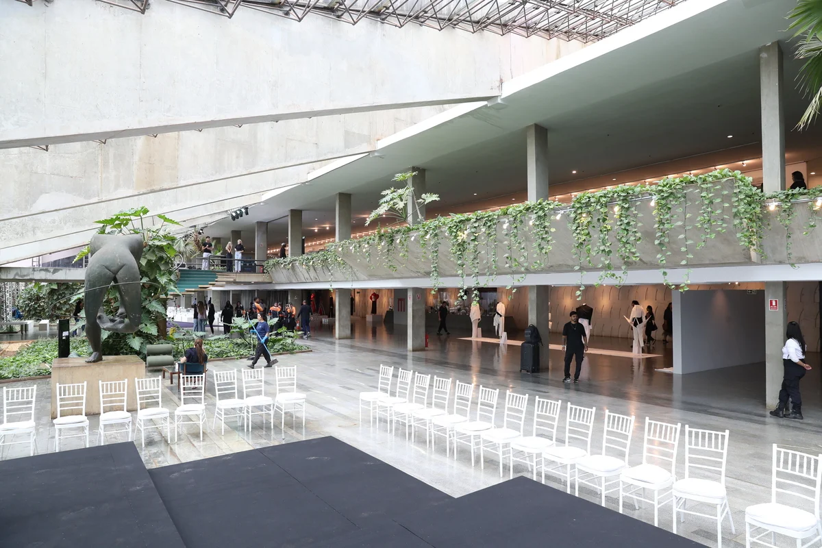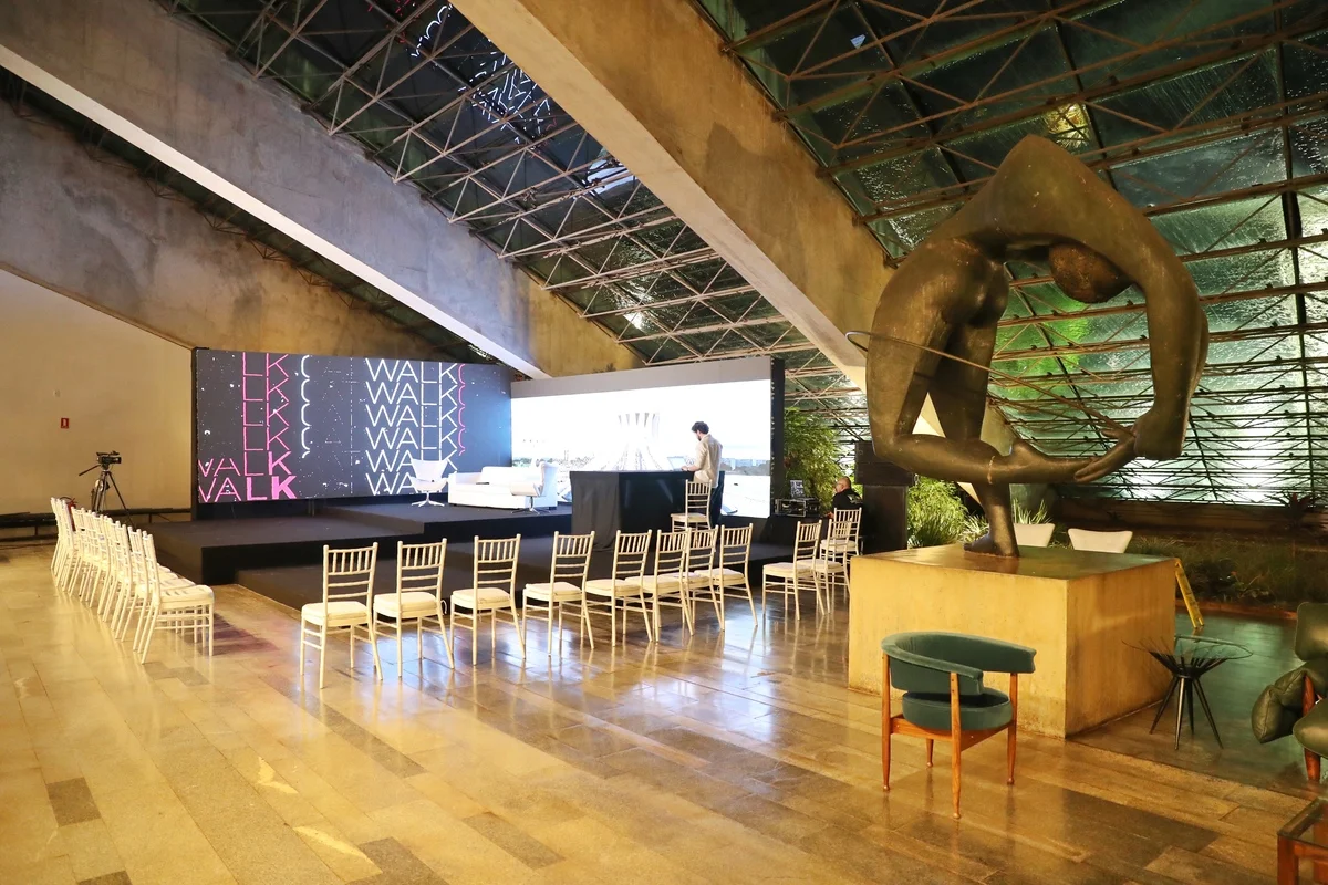 O foyer também conta com uma longa passarela, na qual nomes como Isabeli Fontana, Vivi Orth e Caroline Trentini desfilarão pelo Metrópoles Catwalk. Ao redor da passarela, dezenas de bancos garantem conforto e para que o público do evento inédito veja de perto as criações que movimentam a moda nacional.
