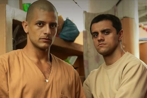 Kelner Macêdo e Felipe Simas como os irmãos Cravinhos em Tremebé, do Prime Video