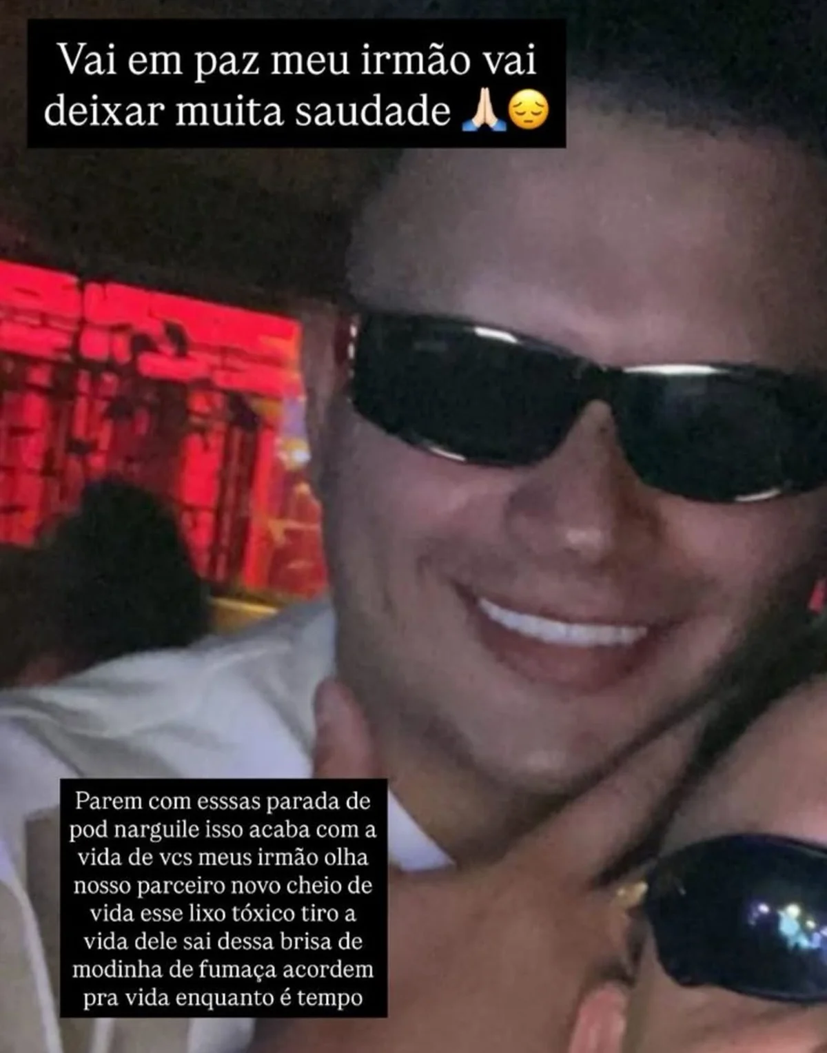 “Vai em paz, meu irmão. Vai deixar muita saudade”, começou ele, antes de completar: “Parem com essas parada de pod e narguile. Isso acaba com a vida de vocês, meus irmão. Olha nosso parceiro novo e cheio de vida. Esse lixo tóxico tirou a vida dele”, lamentou.