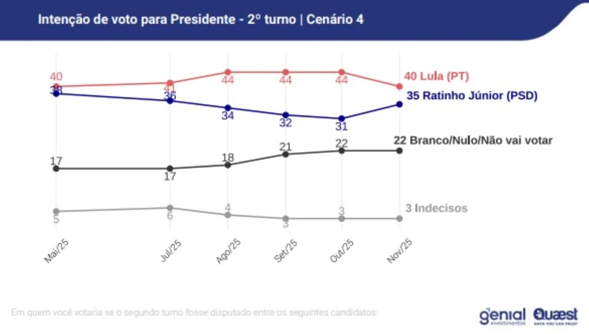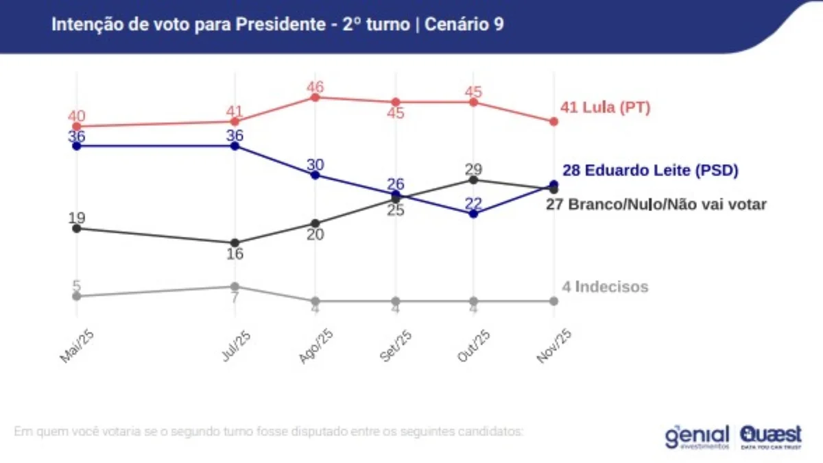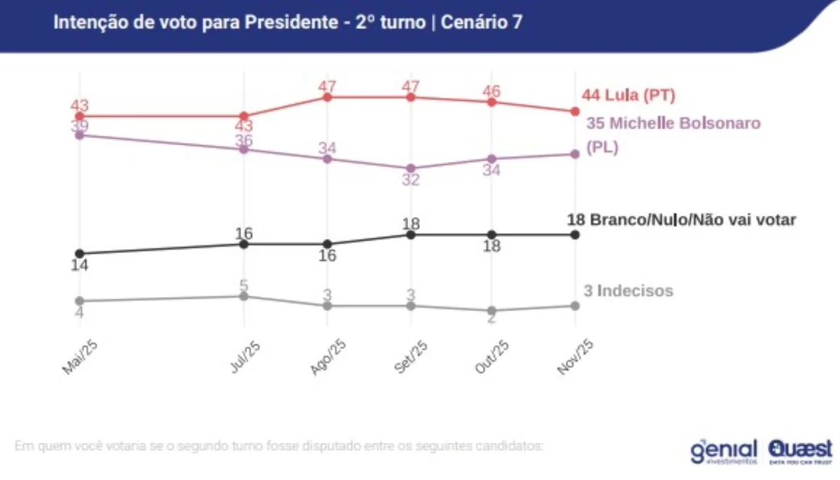 A nova rodada da pesquisa Genial/Quaest sobre intenções de voto para a Presidência da República em 2026, divulgada nesta quinta-feira (13/11), mostra o presidente Luiz Inácio Lula da Silva (PT) na liderança em todos os cenários de primeiro turno. O levantamento indica, também, que o petista continua à frente nas simulações de segundo turno, mas com margem menor do que a registrada na sondagem anterior, de outubro.