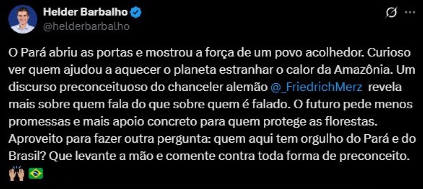 “O Pará abriu as portas e mostrou a força de um povo acolhedor. Curioso ver quem ajudou a aquecer o planeta estranhar o calor da Amazônia. Um discurso preconceituoso do chanceler alemão Friedrich Merz revela mais sobre quem fala do que sobre quem é falado”, escreveu.