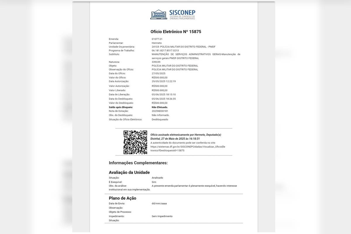 A emenda do deputado distrital Hermeto foi autorizada em 29 de maio de 2025. No dia 5 de junho, o valor foi liberado, de acordo com documento obtido pela reportagem. Veja: