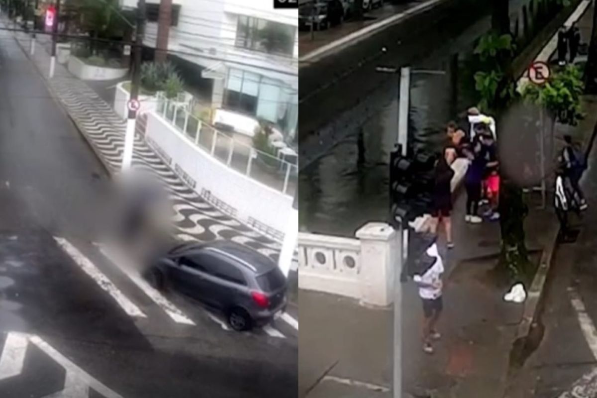 Imagens do Centro de Controle Operacional da Prefeitura de Santos mostram o momento em que o homem atravessa a rua pela faixa de pedestres e é atingido por um carro, que faz uma curva em alta velocidade. Depois que o homem cai no canal, o motorista desce do carro e leva as mãos à cabeça, mas volta para o veículo e deixa o local.