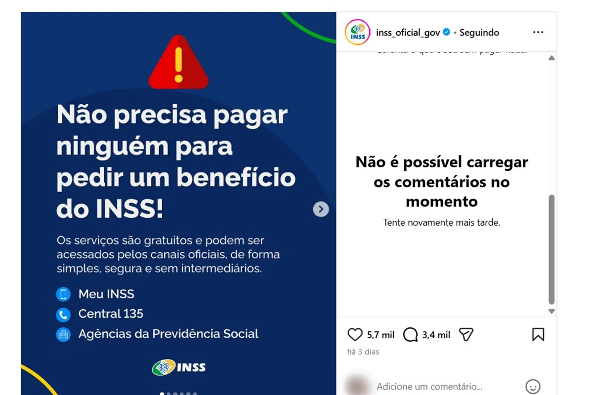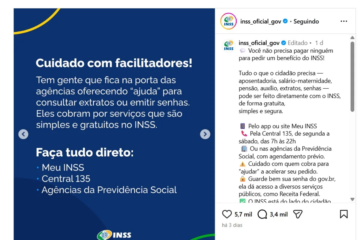 Na última sexta-feira (31/10), o INSS fez uma publicação nas redes sociais e demais canais de comunicação, alertando a população sobre atravessadores que cobram para “acelerar” o pedido junto ao órgão federal, uma vez que o serviço é feito de forma gratuita e direto nos canais de atendimento. “Não existe atalho. Não acredite em facilidades. Só recebe o benefício quem tem direito”.