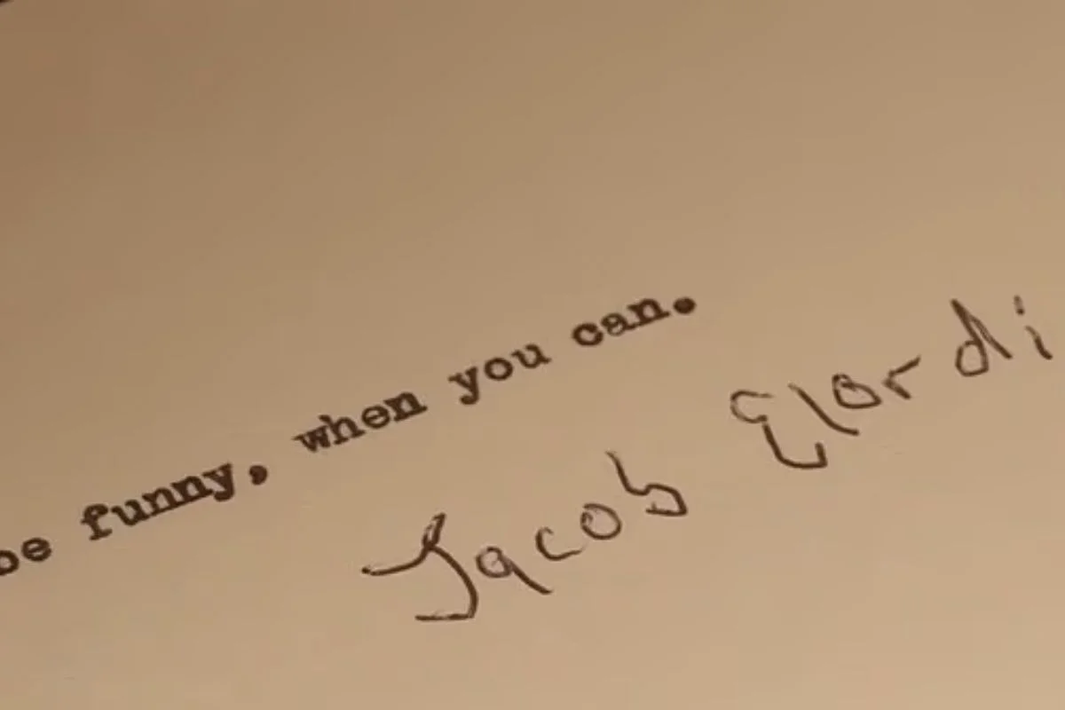 Enquanto a maioria das pessoas assinava com caneta abaixo da citação, Elordi escreveu seu nome em letras de forma. Ele ainda finalizou a assinatura com um emoji sorrindo.