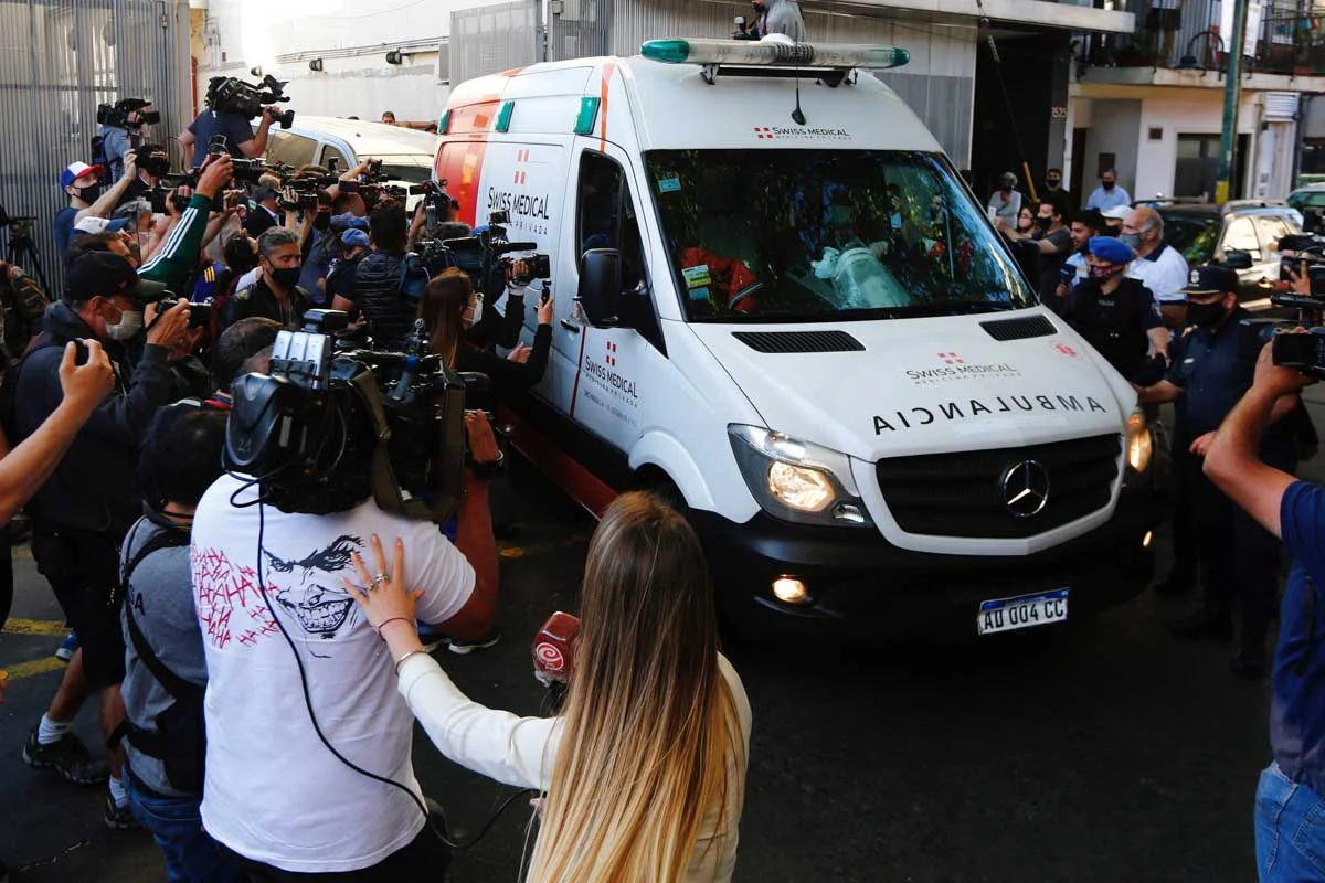 A ambulância que transportava Diego Maradona dirige entre a mídia deixando a Clinica Olivos em 11 de novembro de 2020 em Vicente Lopez, Argentina
