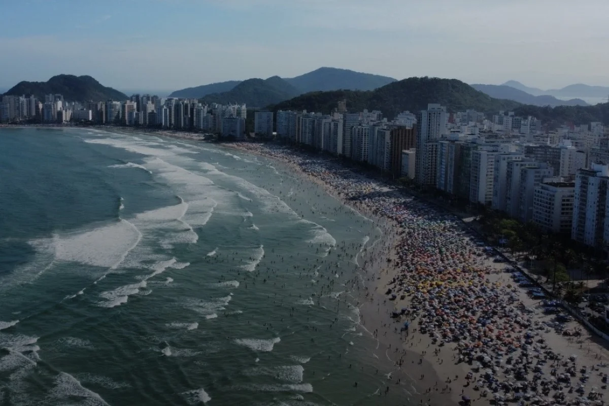 Vista aérea de praia no Guarujá, no litoral de São Paulo