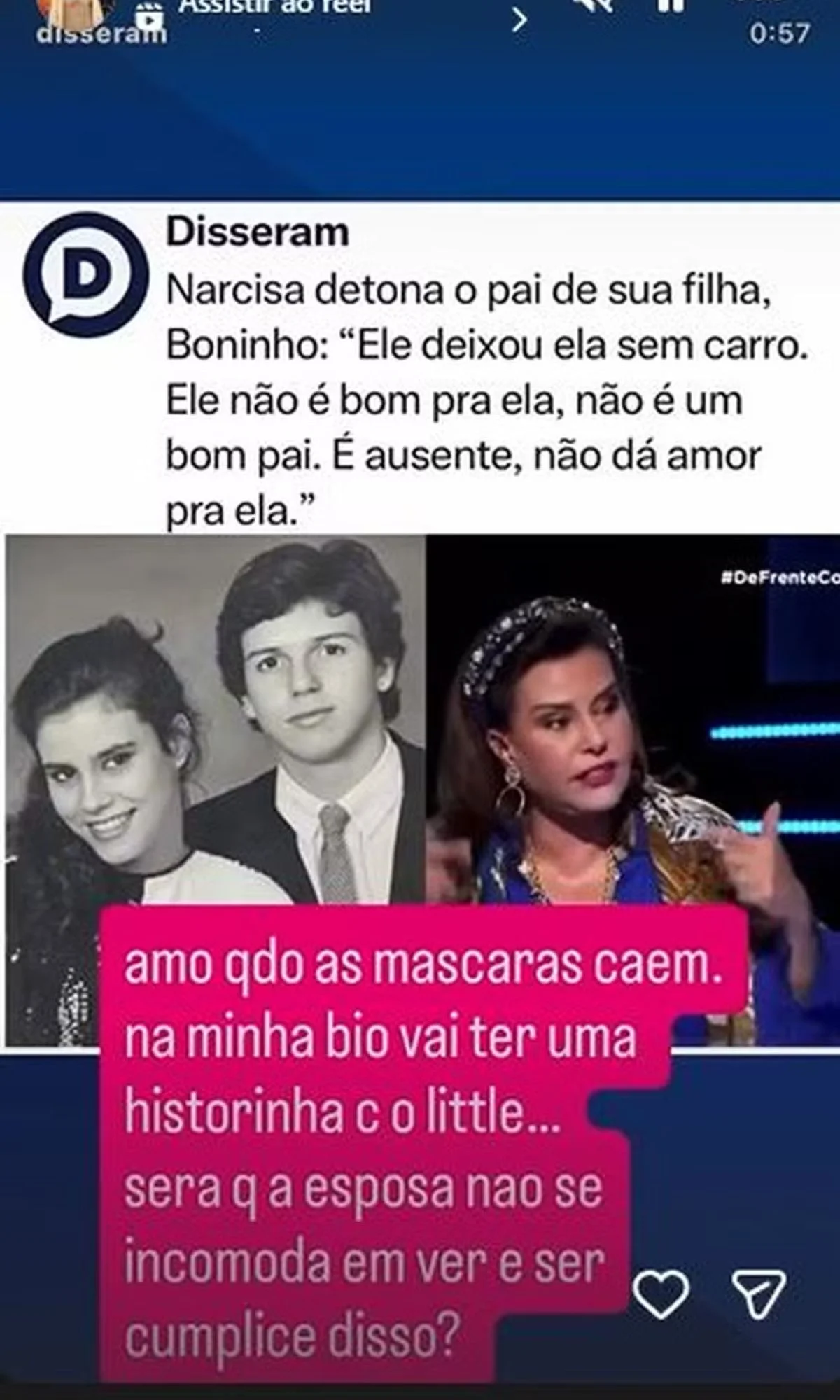 “Amo quando as máscaras caem. Na minha bio vai ter uma historinha com o Little… [Boninho] Será que a esposa [Ana Furtado] não se incomoda em ver e ser cúmplice disso?”, questionou ela.