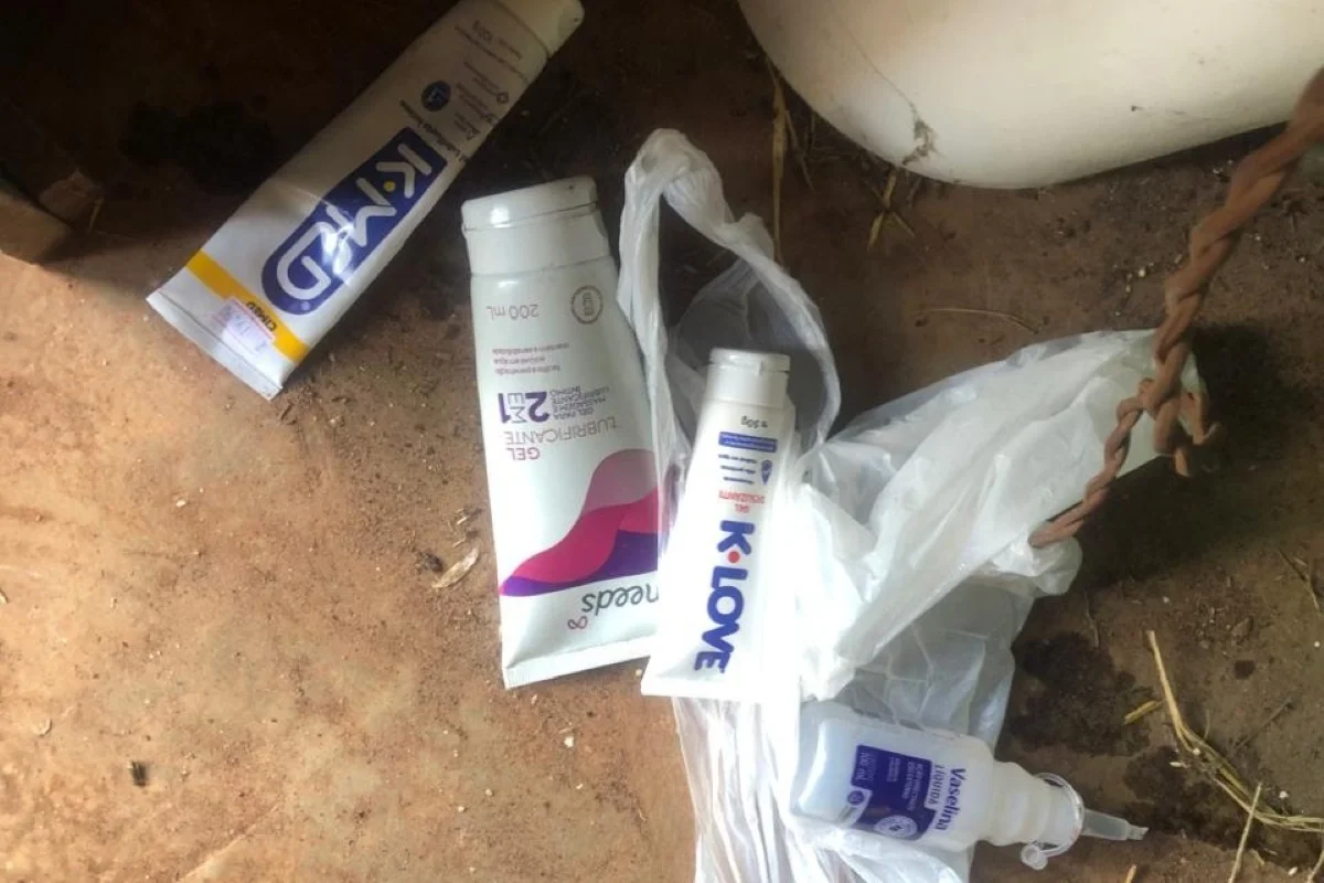 Na chácara foram encontrados manchas de sangue nos colchões, apetrechos sexuais, lubrificantes íntimos e até lubrificante industrial.