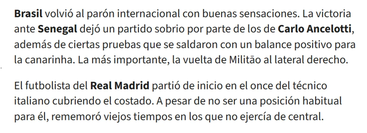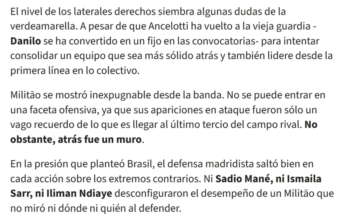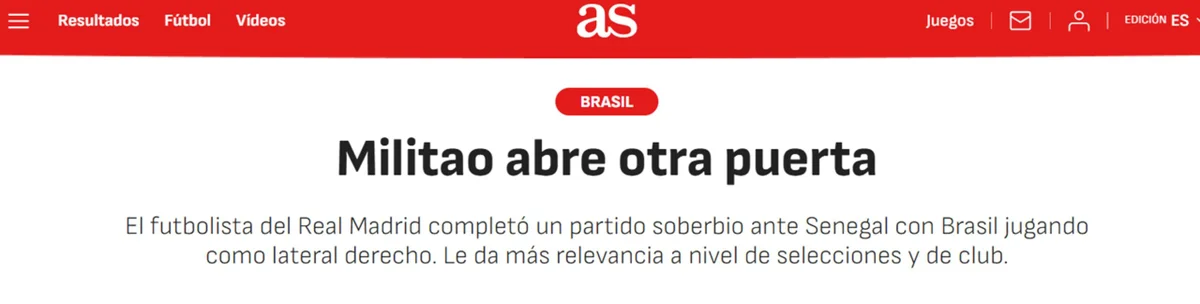 “Militão abre outra porta: o jogador do Real Madrid teve uma atuação soberba contra o Senegal pela seleção brasileira, jogando como lateral-direito. Isso lhe confere maior reconhecimento tanto na seleção quanto no clube.”