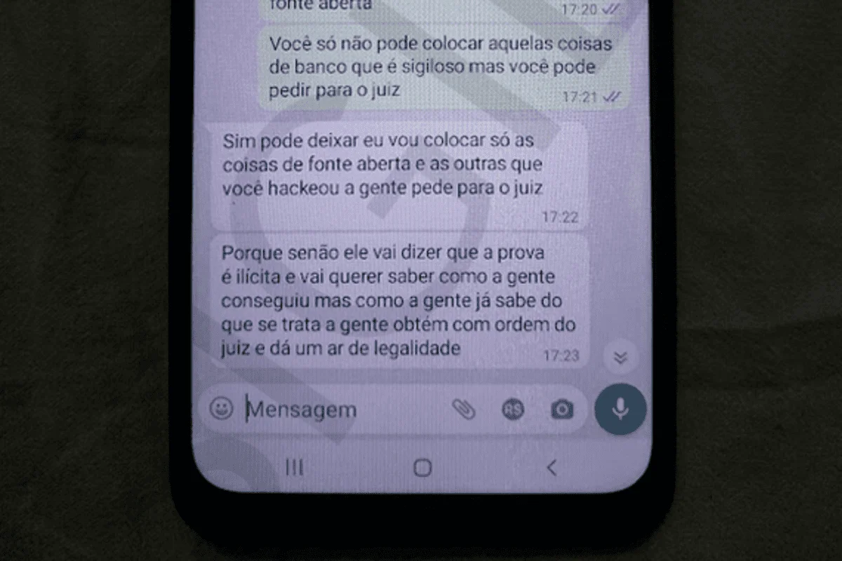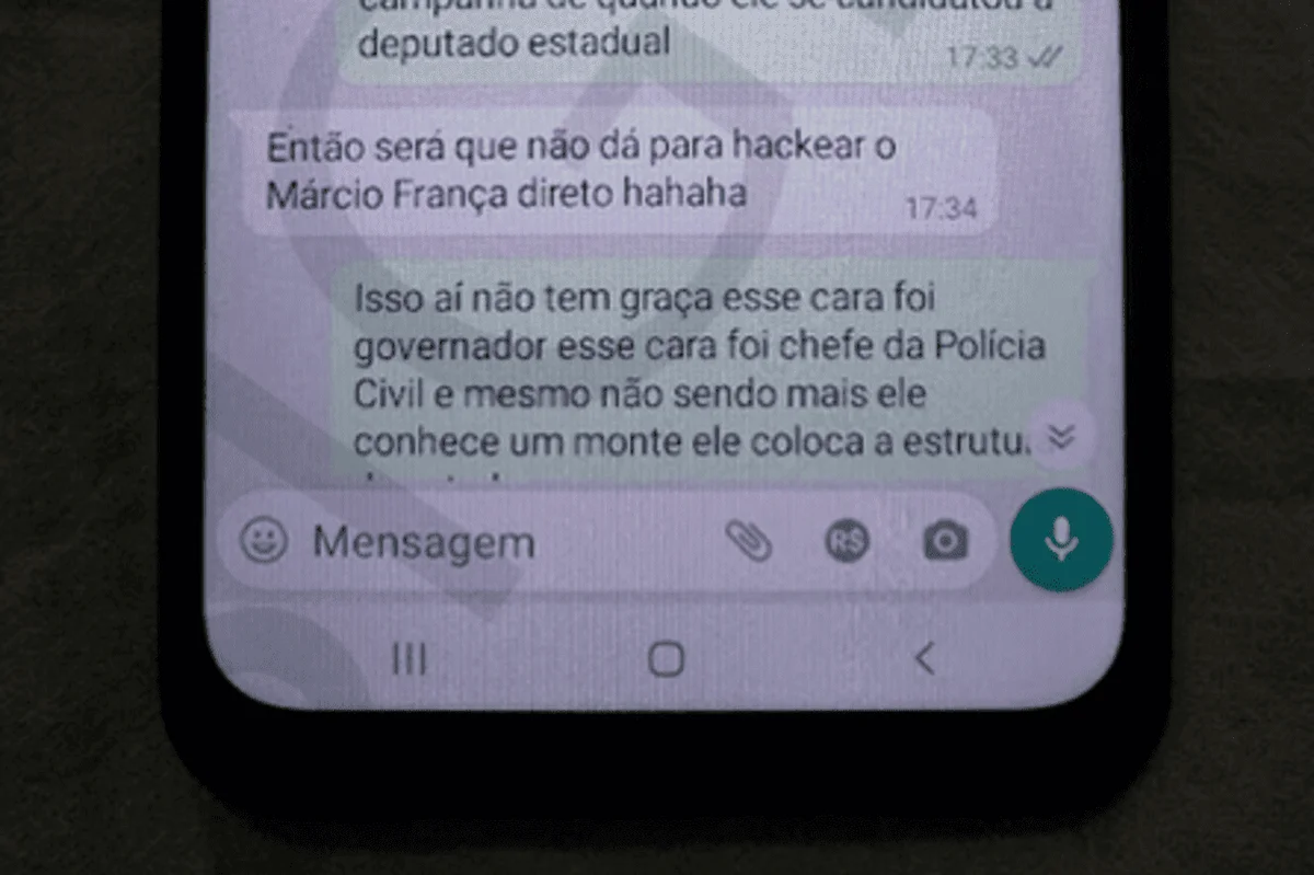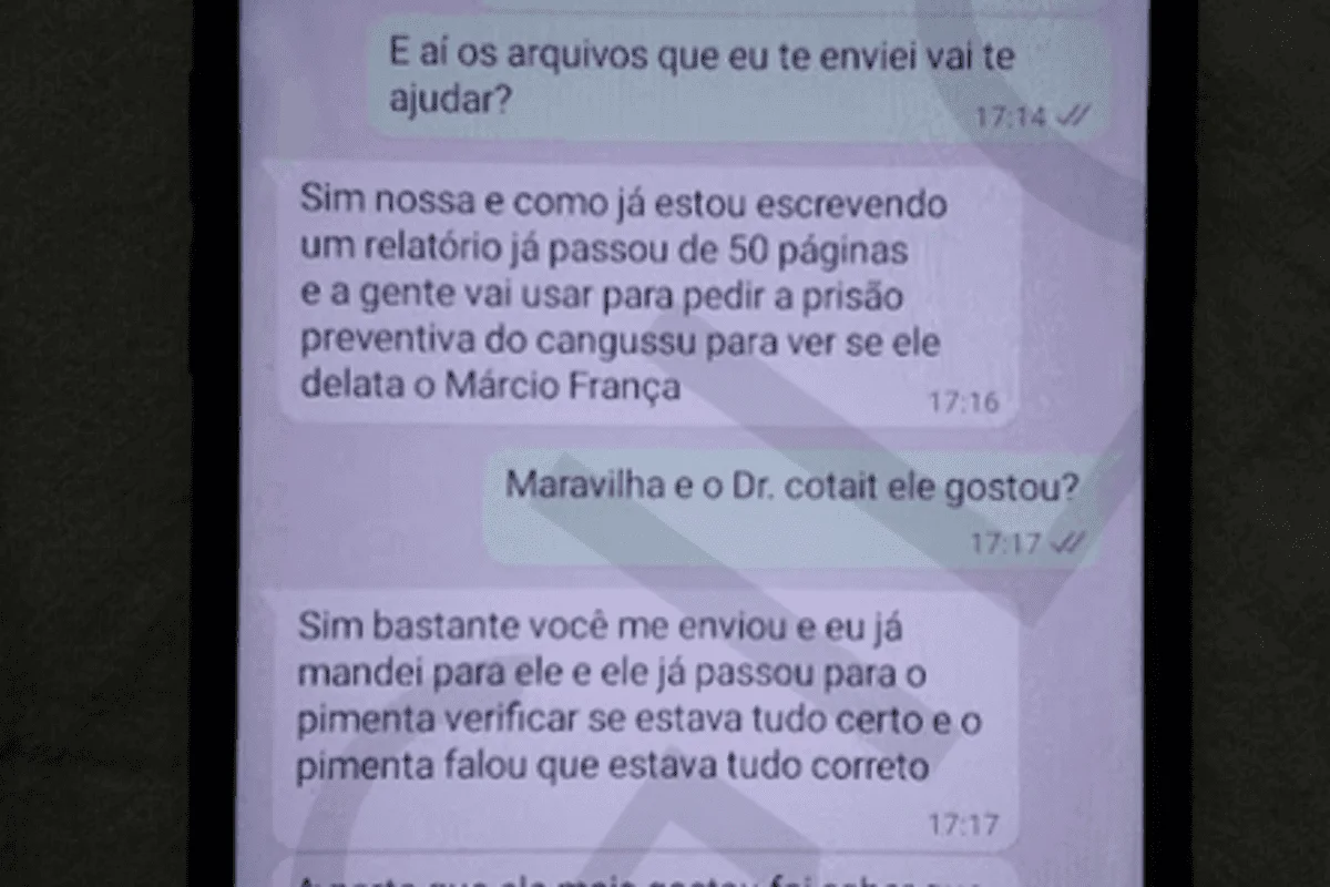“Já estou escrevendo um relatório que já passou de cinquenta páginas e a gente vai usar para pedir a prisão preventiva do Cangussu para ver se ele delata o Márcio França”, afirmou, segundo os prints das mensagens entregues pelo hacker. Ela ainda teria sugerido que Brito hackeasse o próprio político: “Será que não dá para hackear o Márcio França direto, haha”.
