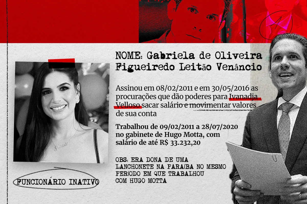 Antes de constar como secretária parlamentar de Hugo Motta, Gabriela foi nomeada em 5 de fevereiro de 2014 na mesma função no gabinete do ex-deputado federal Wilson Filho, hoje secretário de Educação da Paraíba e aliado do presidente da Câmara. Se somar ambos os períodos como funcionária fantasma, a remuneração supera R$ 890,5 mil, sem correção da inflação.