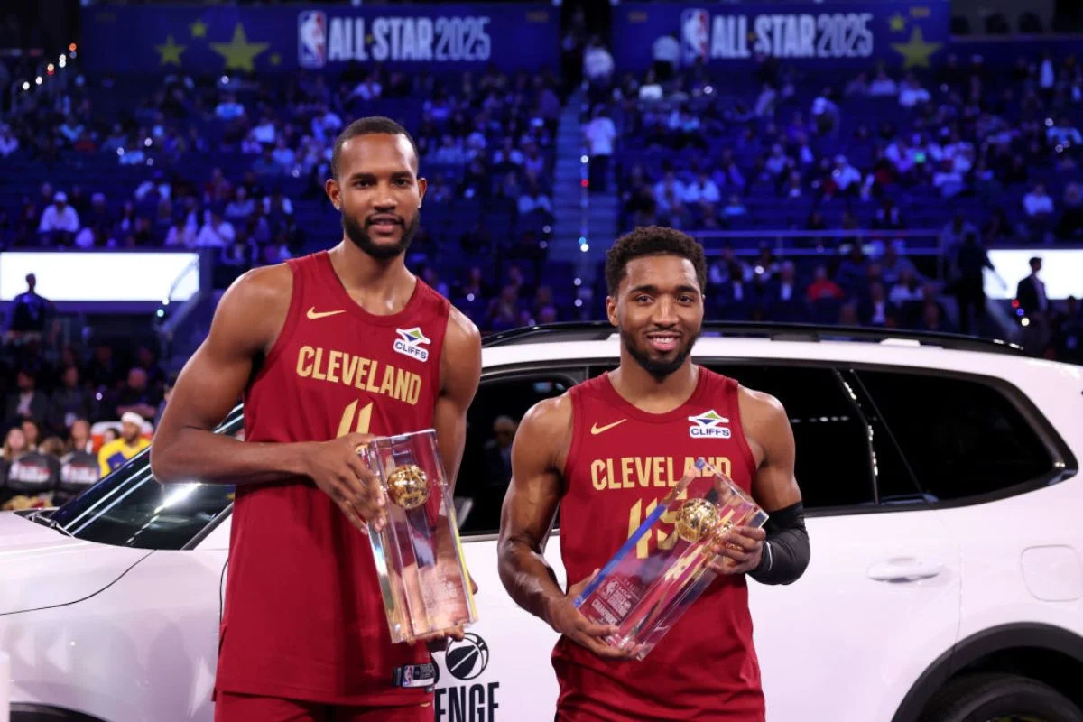 Evan Mobley #4 e Donovan Mitchell #45 do Cleveland Cavaliers