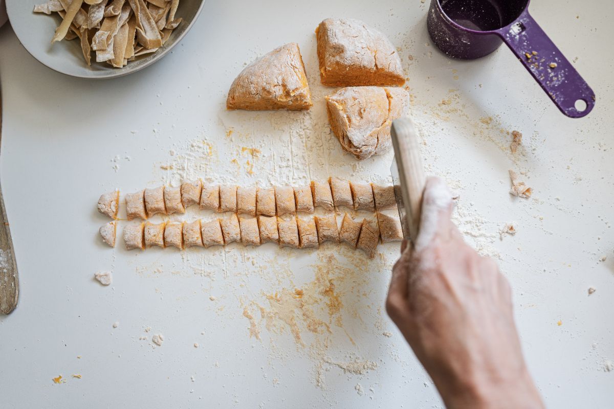 Polvilhe farinha em uma bancada, pegue porções da massa, forme rolinhos e corte em pedaços pequenos.