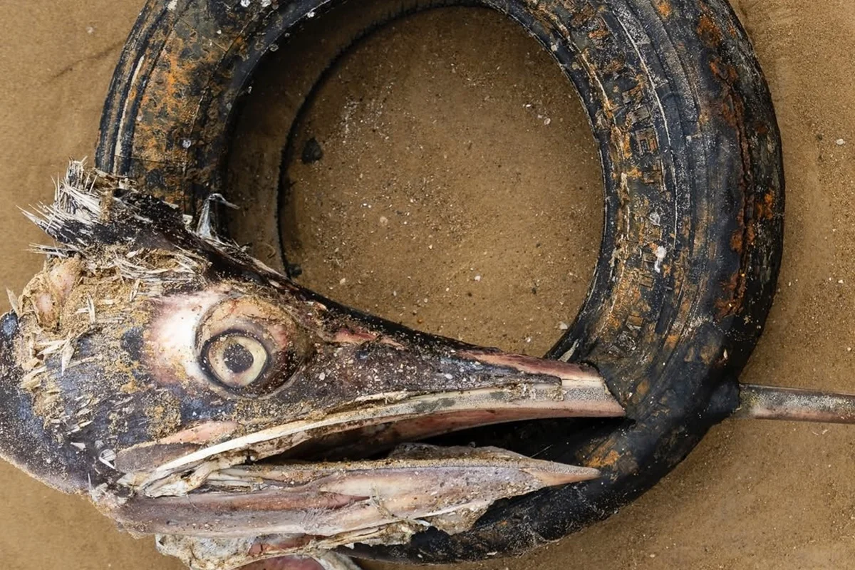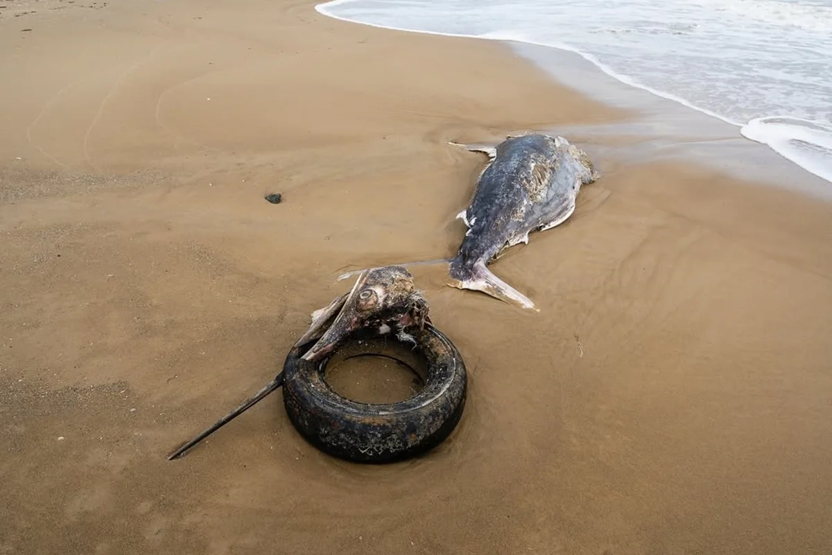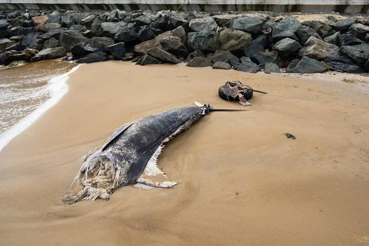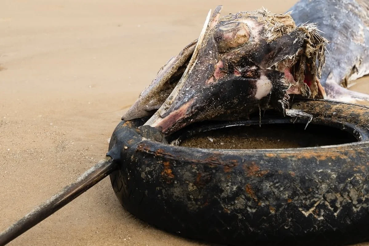 Um peixe de grande porte foi encontrado morto, na última quarta-feira (12/11), com o bico preso em um pneu. A cena foi registrada em uma praia de Balneário Piçarras, em Santa Catarina.