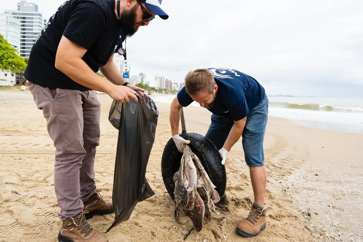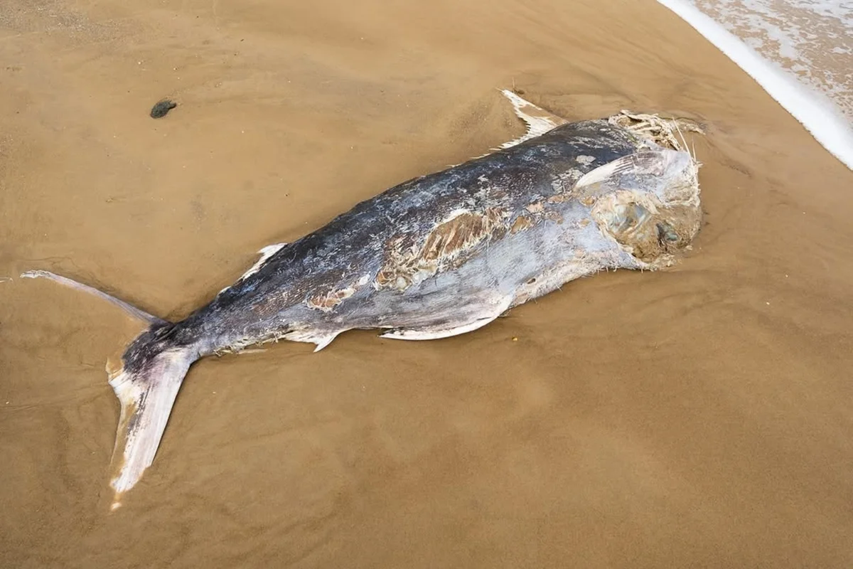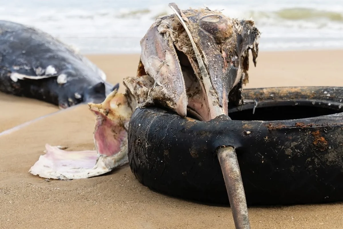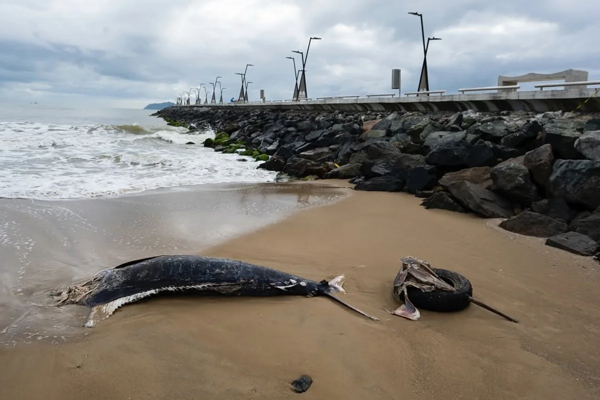Um peixe de grande porte foi encontrado morto, na última quarta-feira (12/11), com o bico preso em um pneu. A cena foi registrada em uma praia de Balneário Piçarras, em Santa Catarina.