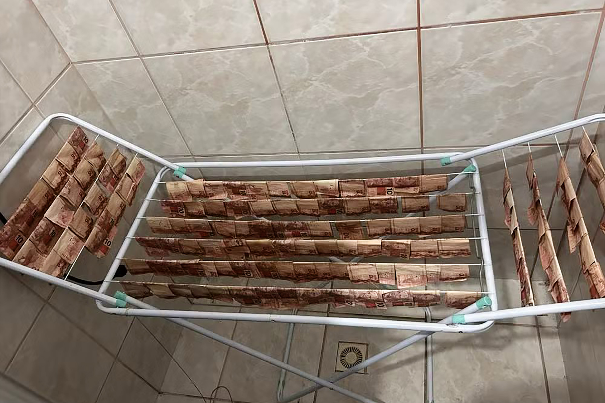 Durante as buscas em Joinville, os policiais encontraram o dinheiro espalhado no varal, na tentativa de secagem. A quantia estava úmida e parte das notas apresentava manchas de mofo.