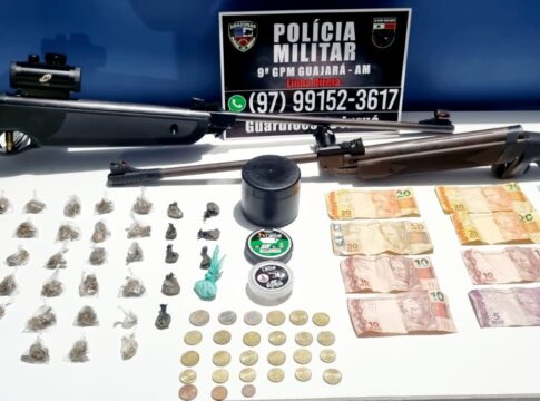Na noite de quinta-feira (13), por volta das 20h30, uma ação da Polícia Militar resultou na apreensão de entorpecentes, armas de pressão e na detenção de um adolescente de 17 anos, no município de Guajará, interior do Amazonas.