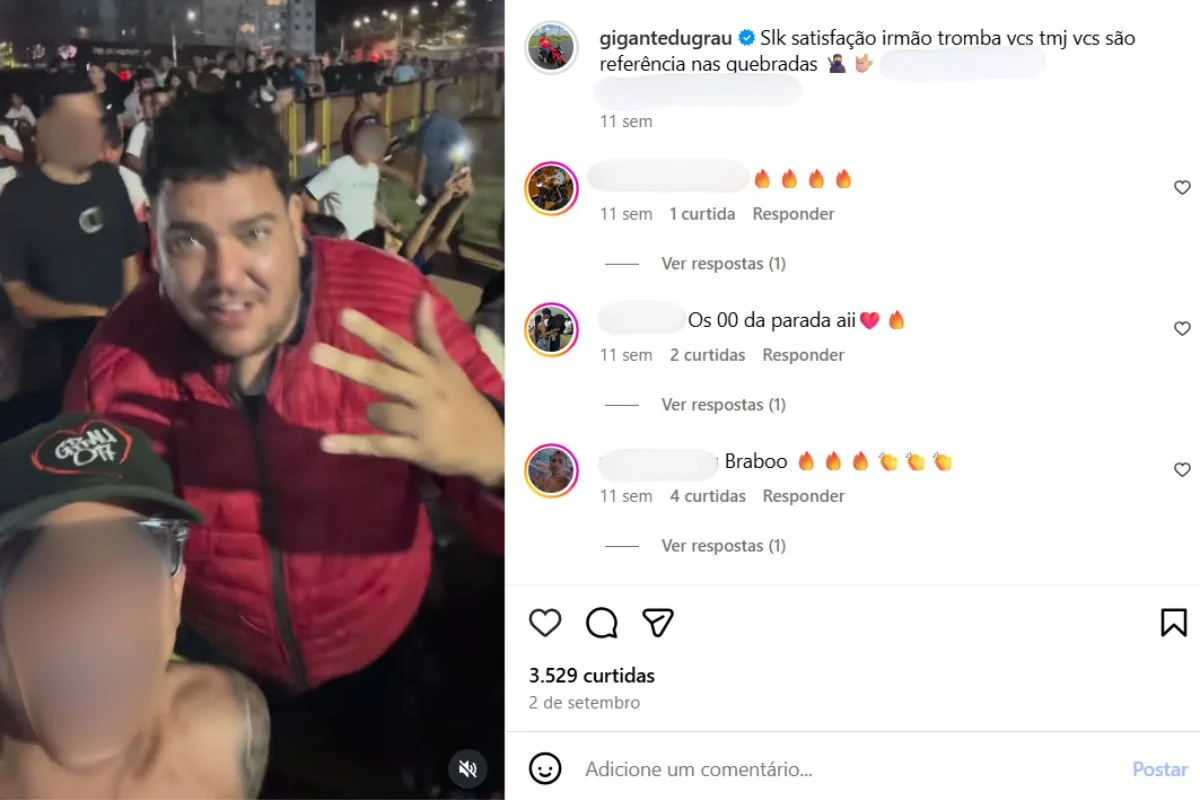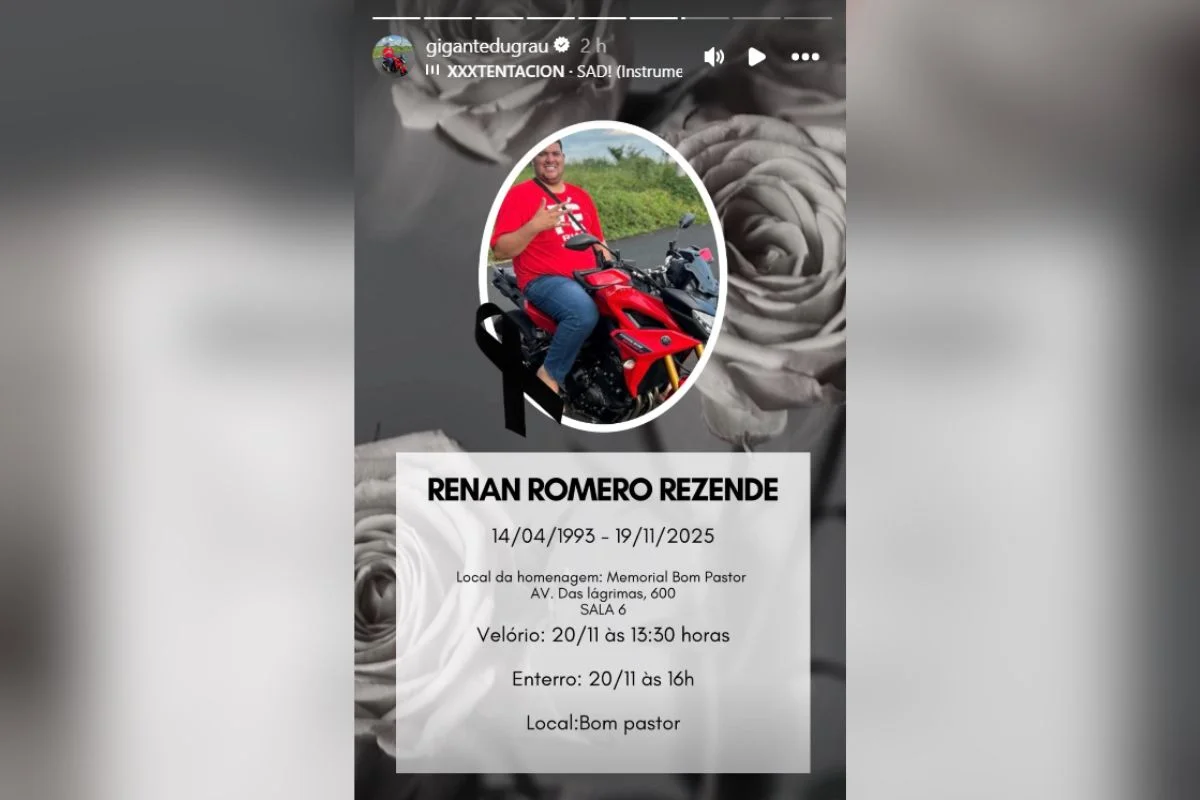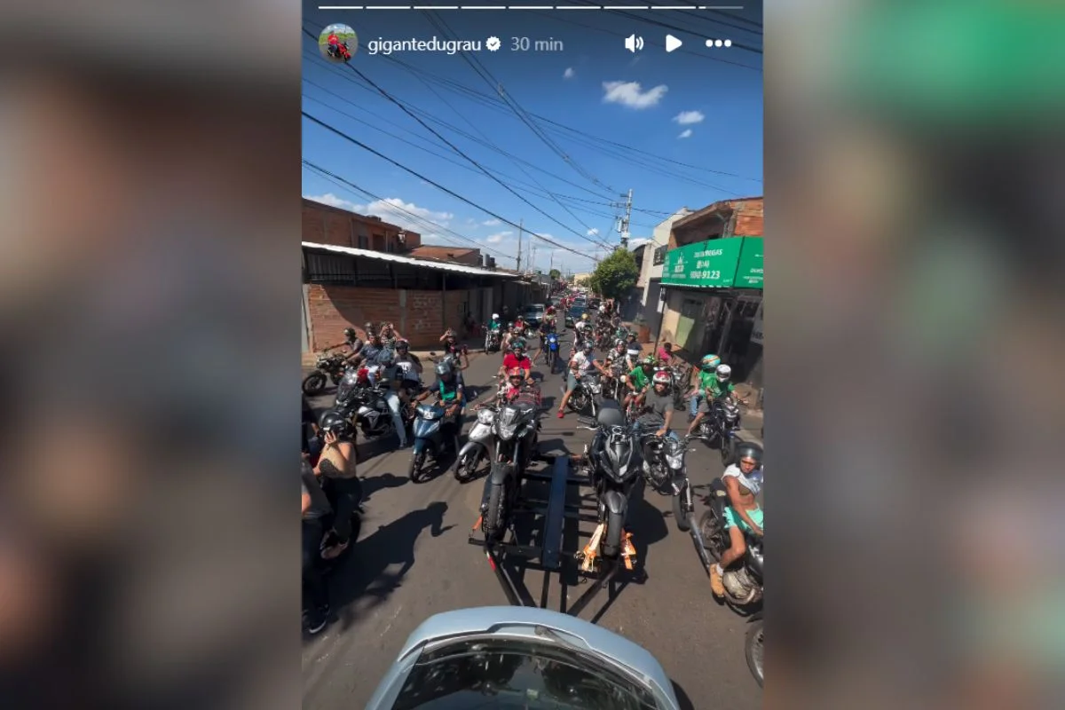 Publicações temporárias publicadas pelo próprio influenciador ainda estavam no ar no início da tarde desta quinta (20/11), quando dois amigos de Gigante do Grau acessaram o perfil dele e divulgaram informações sobre o velório, além de um vídeo que mostra diversos motociclistas homenageando a vítima de homicídio.
