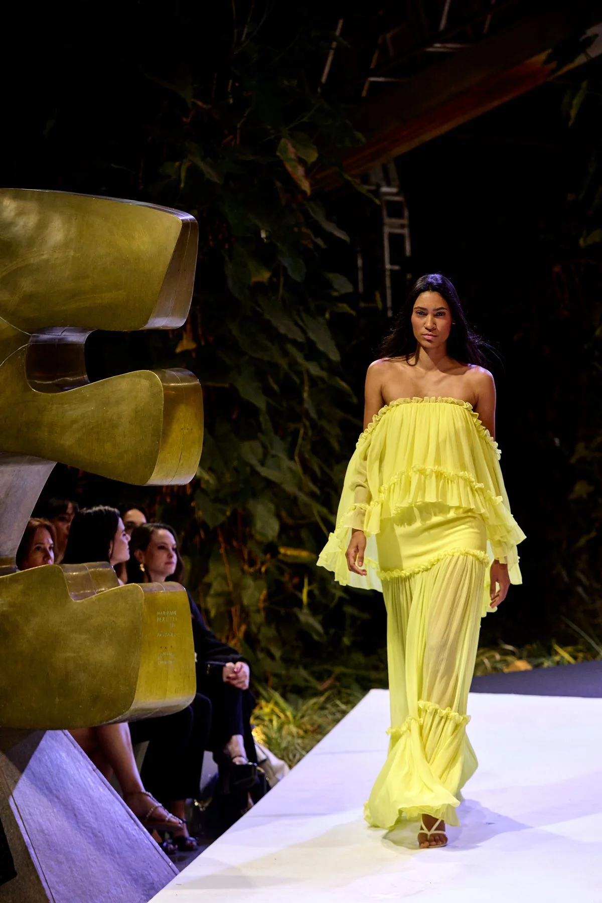 Em uma conexão memorável entre os grandes nomes da moda brasiliense e estilistas de renome internacional, Reinaldo Lourenço exibiu criações atemporais — do jeans à pedraria —, além de tecidos leves que flutuavam sob o palco, no Foyer da Sala Villa-Lobos.