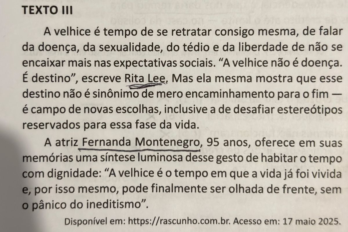A prova destacou também uma fala de Rita Lee sobre o envelhecimento: “A velhice não é doença. É destino”. Ela já havia aparecido no Enem 2024 em uma questão de interpretação de texto. Na ocasião, o exame trouxe trechos de Rita Lee: Outra Autobiografia, livro lançado pela cantora em 2023.