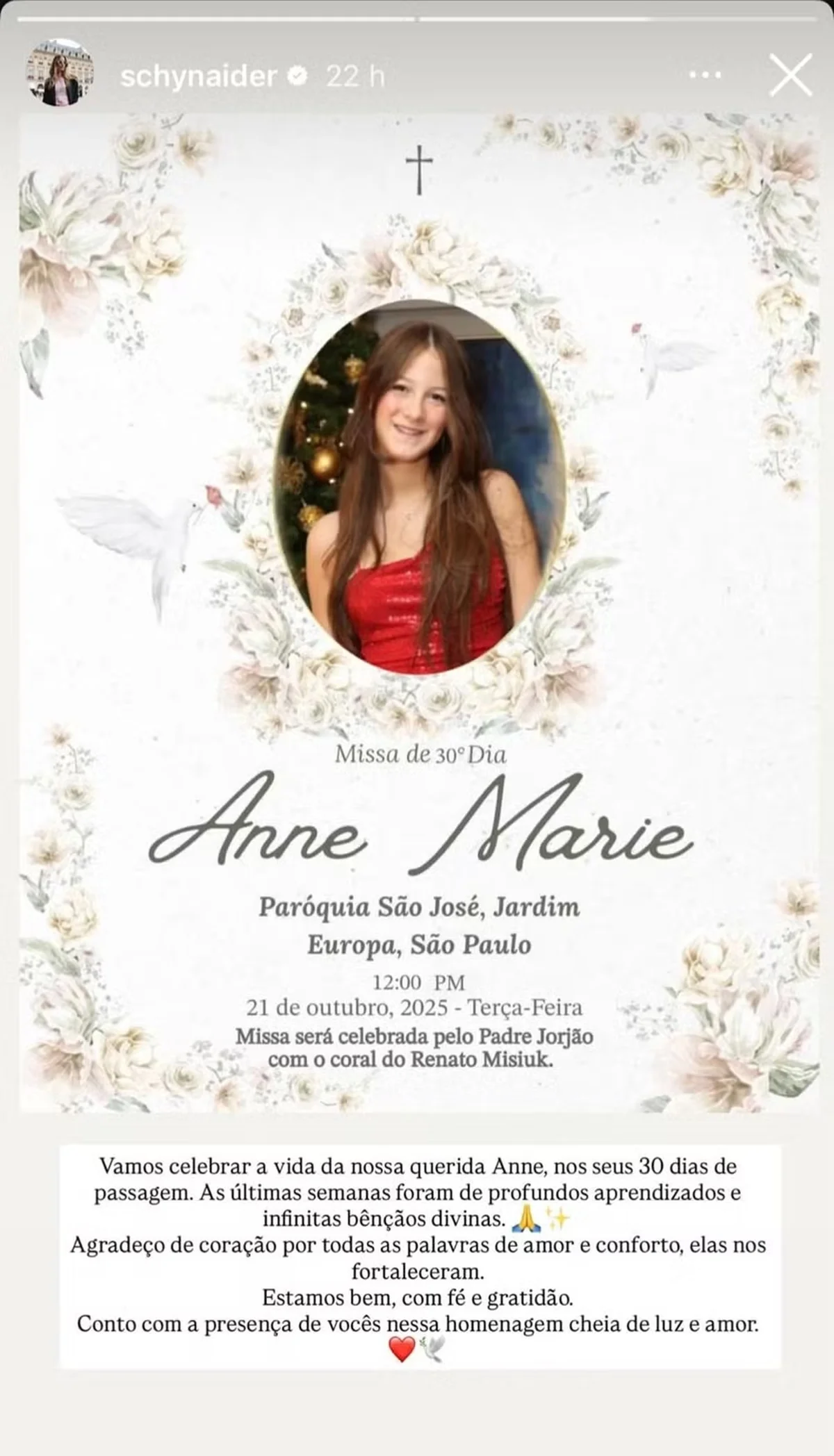 Pouco mais de duas semanas após perder a filha Anne Marie, aos 16 anos, Schynaider Moura voltou as redes sociais, no início de outubro, para falar sobre o luto e agradecer o apoio que vem recebendo desde então.