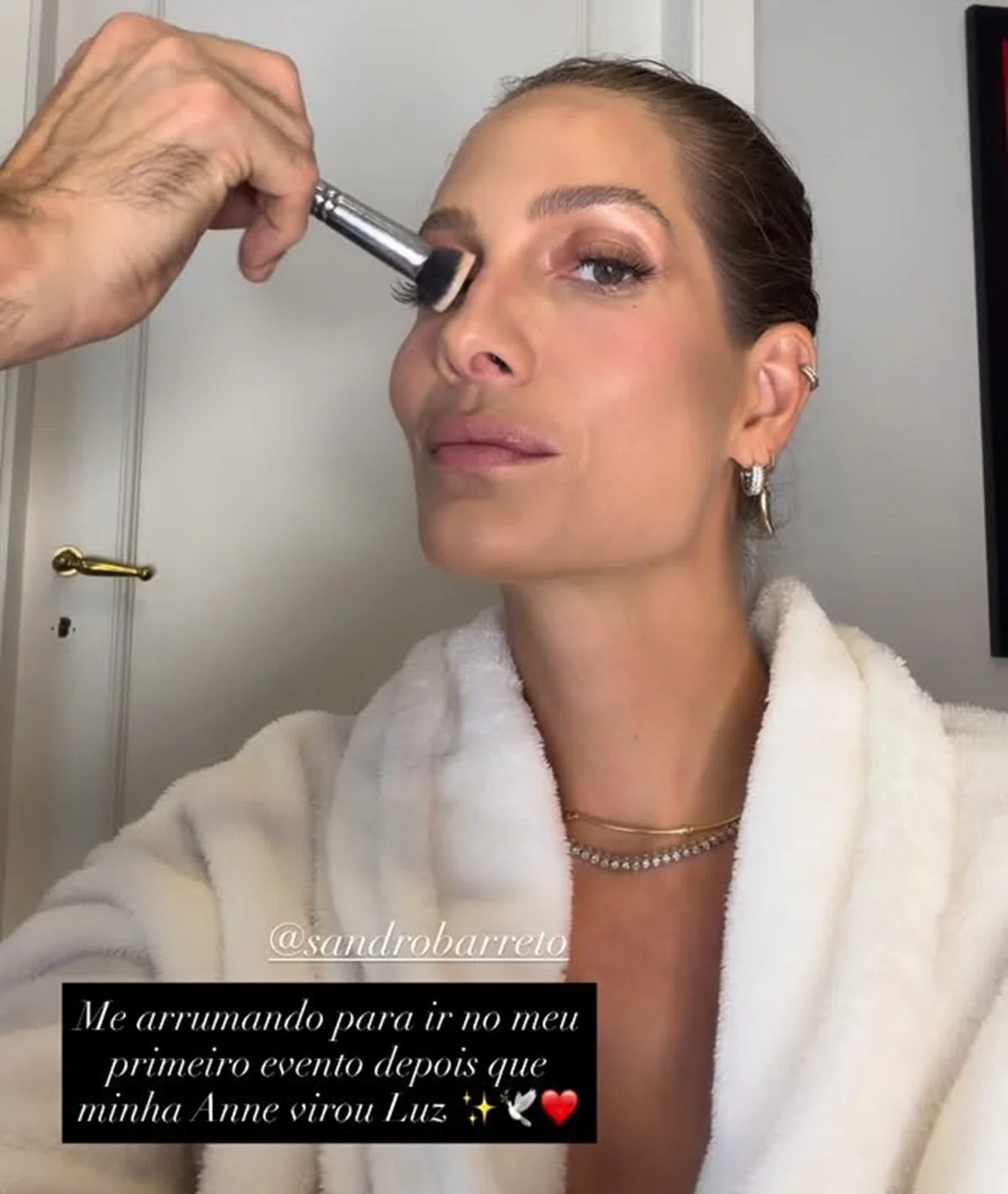 “Me arrumando para ir no meu primeiro evento depois que minha Anne virou luz”, publicou ela, enquanto fazia maquiagem.