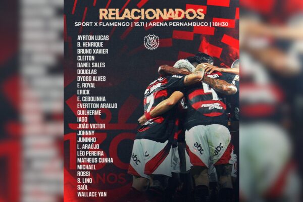 O Flamengo divulgou nesta sexta-feira (14/11) os relacionados para o confronto contra o Sport. As equipes entram em campo neste sábado (15/11), às 18h30, na Arena Pernambuco. O time carioca não contará, mais uma vez, com Pedro. O atacante segue fora por conta de uma fratura no antebraço.