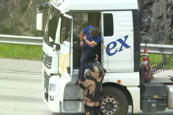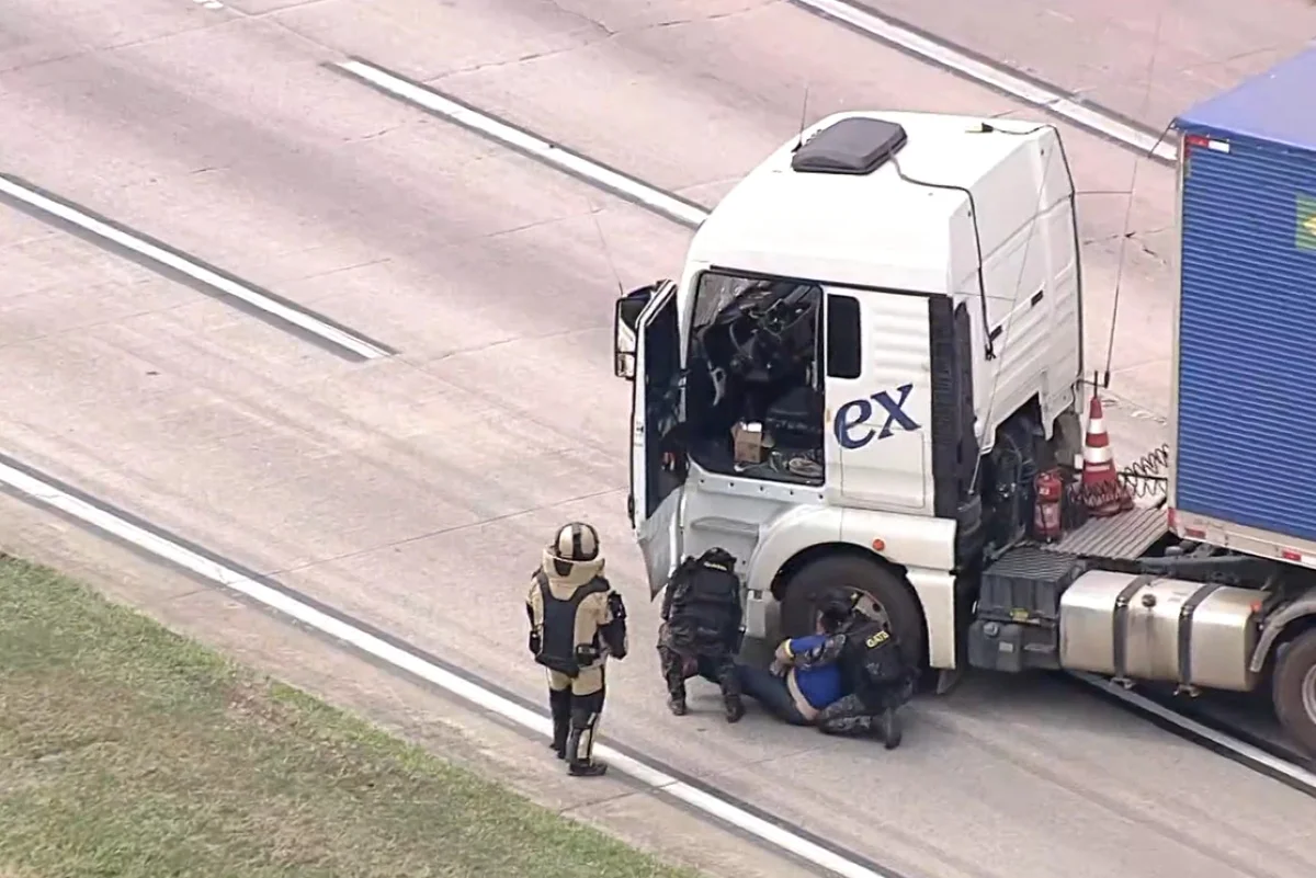 - Os PMs tentaram contato com o motorista, mas ele estava em estado de choque. Inicialmente, o homem avisou a outros condutores presentes no local que havia explosivos na boleia do caminhão.