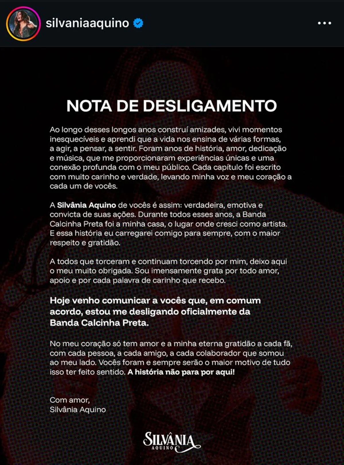 Silvânia Aquino revelou por meio do Instagram sua saída da Calcinha Preta. “Ao longo desses longos anos construí amizades, vivi momentos inesquecíveis e aprendi que a vida nos ensina de várias formas, a agir, a pensar, a sentir. Foram anos de história, amor, dedicação e música, que me proporcionaram experiências únicas e uma conexão profunda com o meu público”, começou.