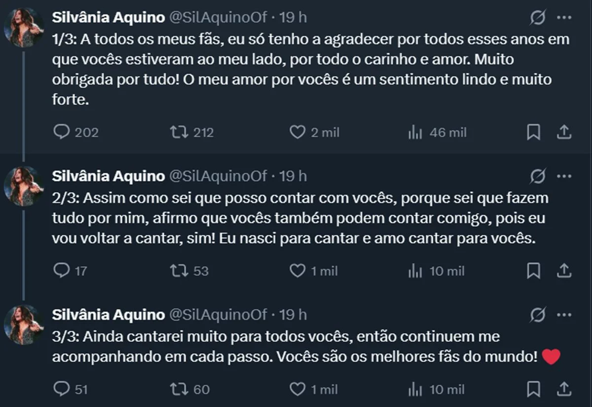 Em seguida, ela declarou: “Cada capítulo foi escrito com muito carinho e verdade, levando minha voz e meu coração a cada um de vocês. A Silvânia Aquino de vocês é assim: verdadeira, emotiva e convicta de suas ações”, garantiu.