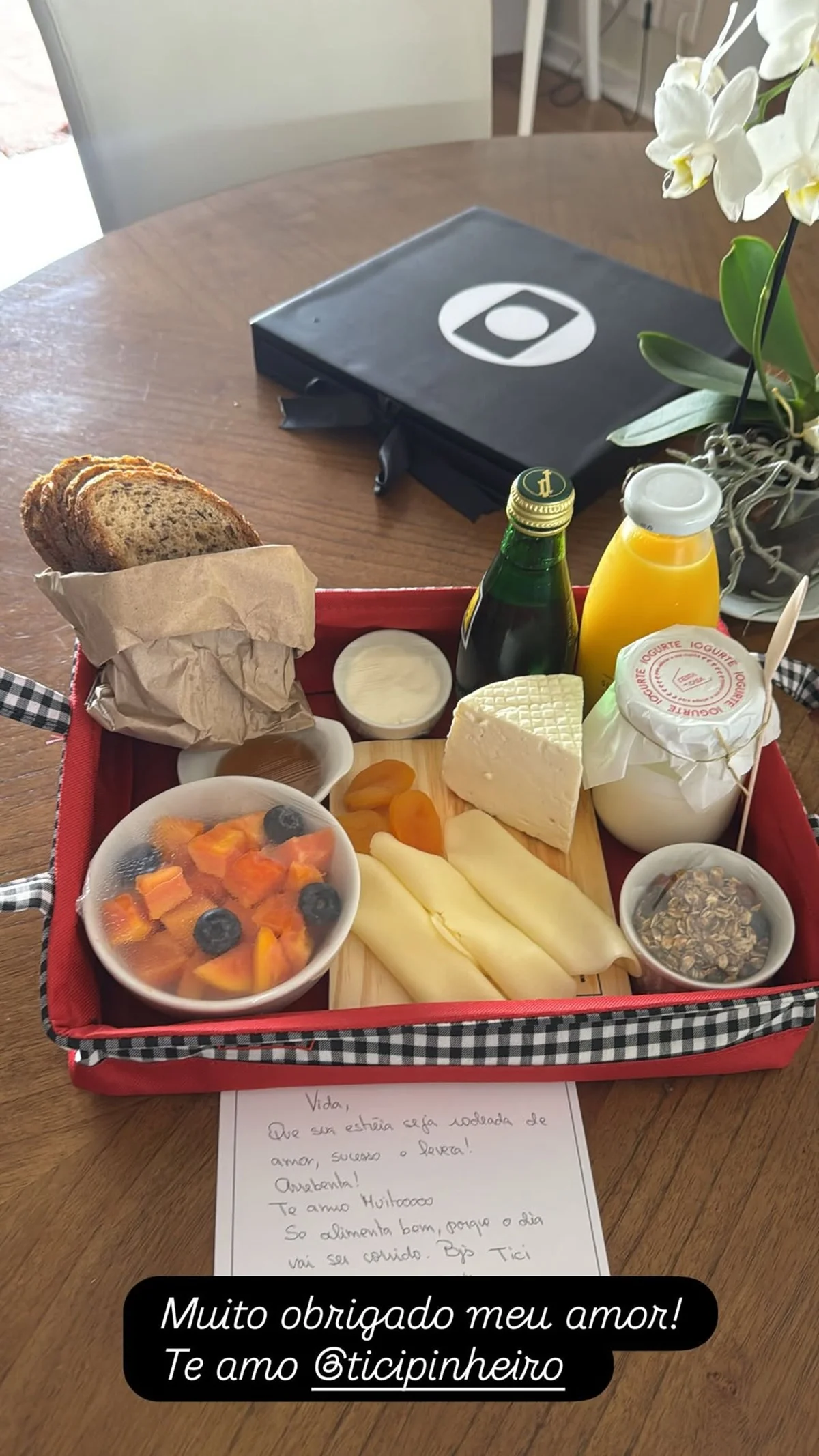Mesmo em São Paulo, onde trabalha na Rede Record, Ticiane fez questão de prestigiar o novo âncora do JN. Junto da cesta, ela preparou um bilhete escrito à mão.