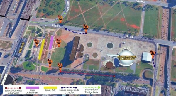 Nas vias entre o Museu Nacional e o Sesi Lab serão sinalizadas áreas para vendedores ambulantes e estacionamento para táxi. Os agentes também sinalizarão os pontos de embarque e desembarque de passageiros próximos ao museu. Na via S2, será delimitado um espaço para estacionamento e manobra. Durante o evento, o fluxo da via S1 será desviado para a alça leste da rodoviária.