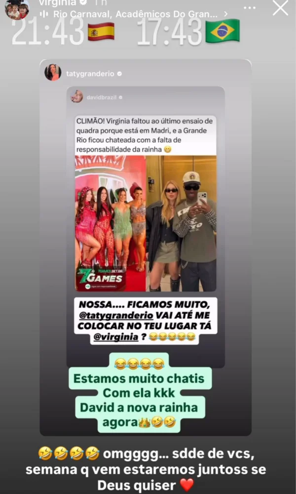 Nos Stories do Instagram, Virginia publicou um post da vice-presidente da Grande Rio, Tatiane Oliveira, que, em conversa com David Brazil, negou qualquer mal-estar por parte da escola de Duque de Caxias.