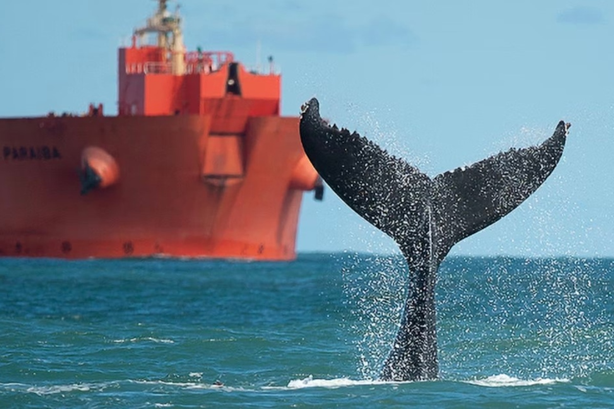 O risco de colisão com navios é constante. Baleias e golfinhos precisam vir à superfície para respirar e, em áreas de tráfego intenso como o sudeste, o risco de serem atingidos por embarcações é alto. Já o ruído constante – tanto dos motores de navios quanto da exploração de petróleo e gás – interfere na orientação, comunicação e caça de baleias e golfinhos.