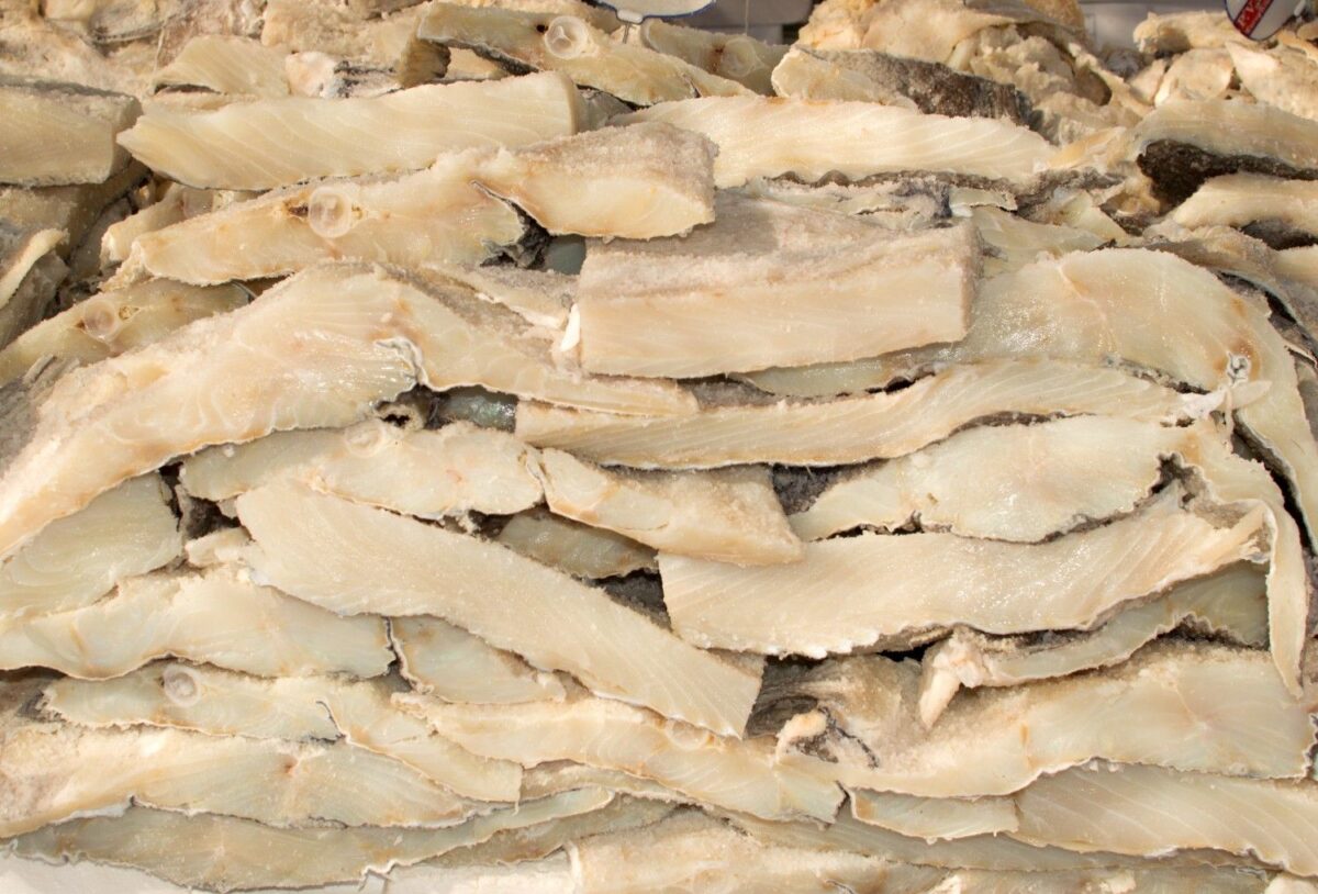 Um bom bacalhau deve ter aparência uniforme, carne clara e solta, sem manchas escuras e com odor suave.