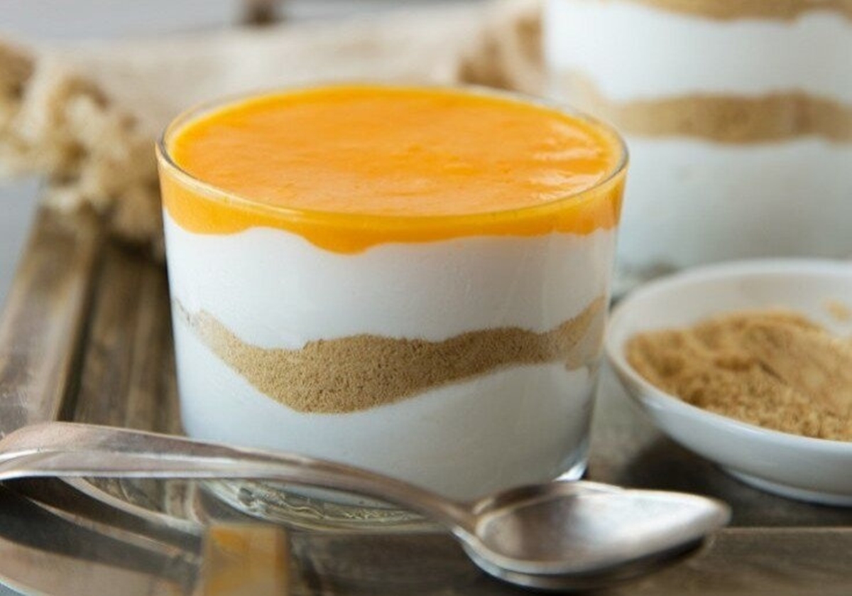 - Em uma travessa, faça camadas alternadas de creme de natas, doce de ovos e farofa de biscoito, repetindo até finalizar os ingredientes.