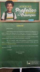 Na carta endereçada pelo presidente Hugo Motta ao chefe do Executivo, ele destaca :”Tenho a honra de informar que a Prefeitura do seu Municipio será agraciada com a Medalha Prefeitos pela Alfabetização das Crianças, que é uma comenda concedida pela Câmara dos Deputados a municípios que tenham se destacado no combate ao analfabetismo”.